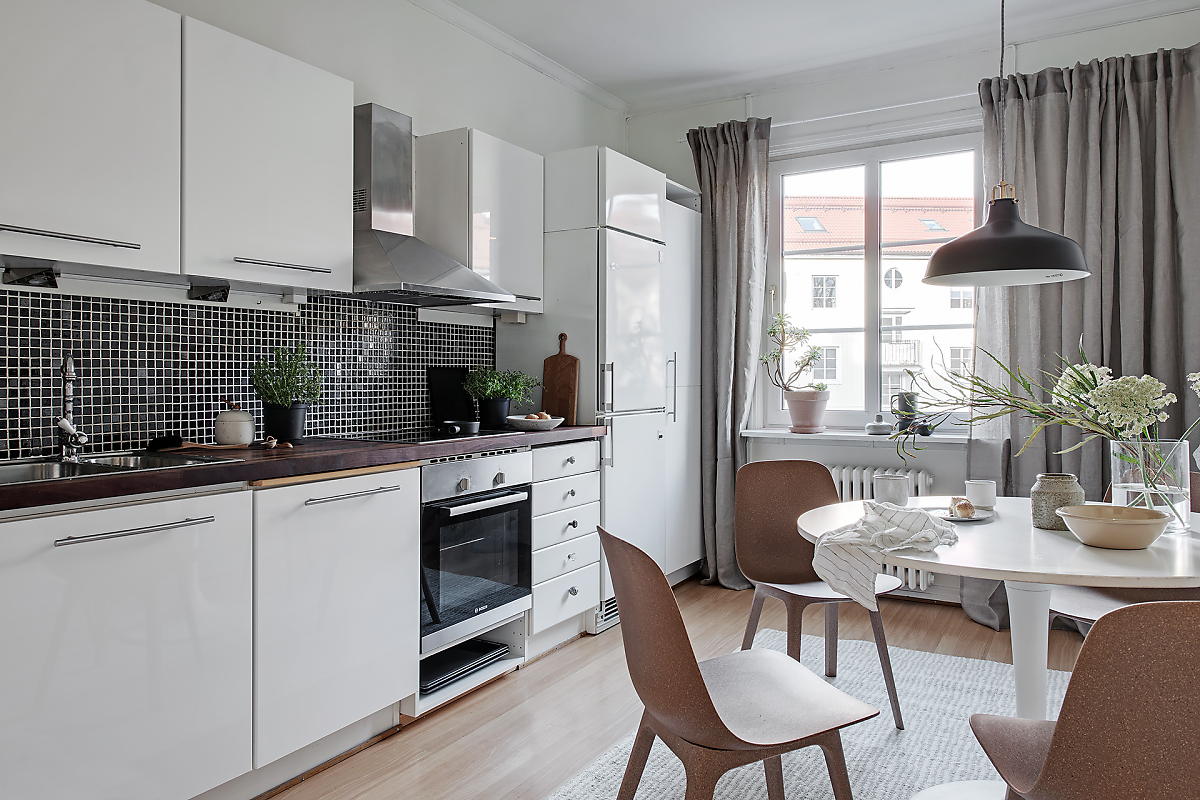 대형 창문이 설치되어 환기와 통풍이 모두 원활한 주방의 경우 블랙 모자이크 타일로 백스플래쉬를 견고하게 마감한 후, 튼튼한 우드 상판이 놓인 심플한 디자인의 화이트 싱크대 세트와 각종 주방 가전을 깔끔하게 배치해 실용성을 강조한 모던 키친을 완성하고 있다.