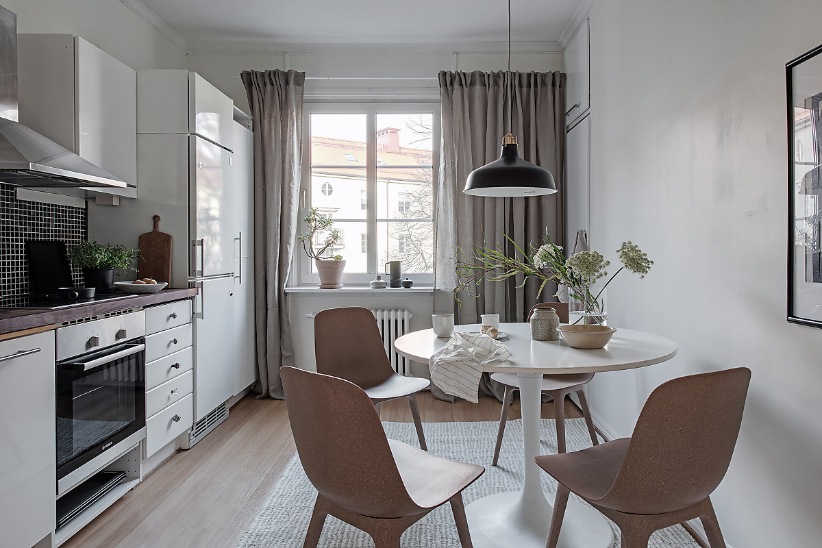 라운드 다이닝 테이블 세트와 펜던트 조명이 조화롭게 어우러진 주방 속 미니 다이닝 공간은 식사와 티타임을 즐길 수 있는 예쁜 홈 카페 스타일로 디자인되어 일상의 여유와 낭만을 더하고 있다.