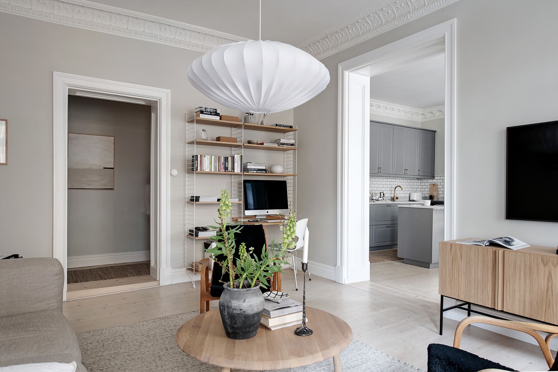 화이트와 그레이 톤 컬러로 깔끔하게 마감된 실내에 원목마루를 시공해 차분하고 편안한 분위기를 연출하고 있는 이 집은 거실, 홈 오피스 겸 작업실, 다이닝룸, 주방, 2개의 침실, 욕실, 화장실, 발코니, 홀, 현관 등으로 구성되어 있다.
