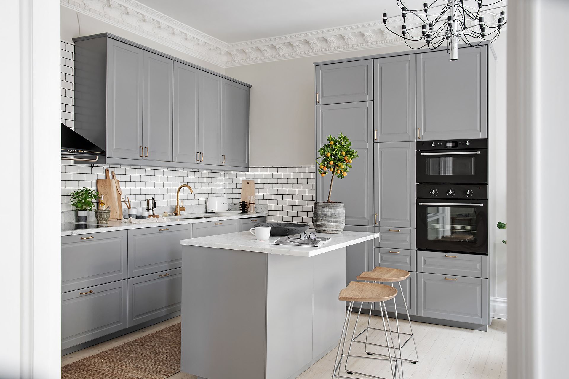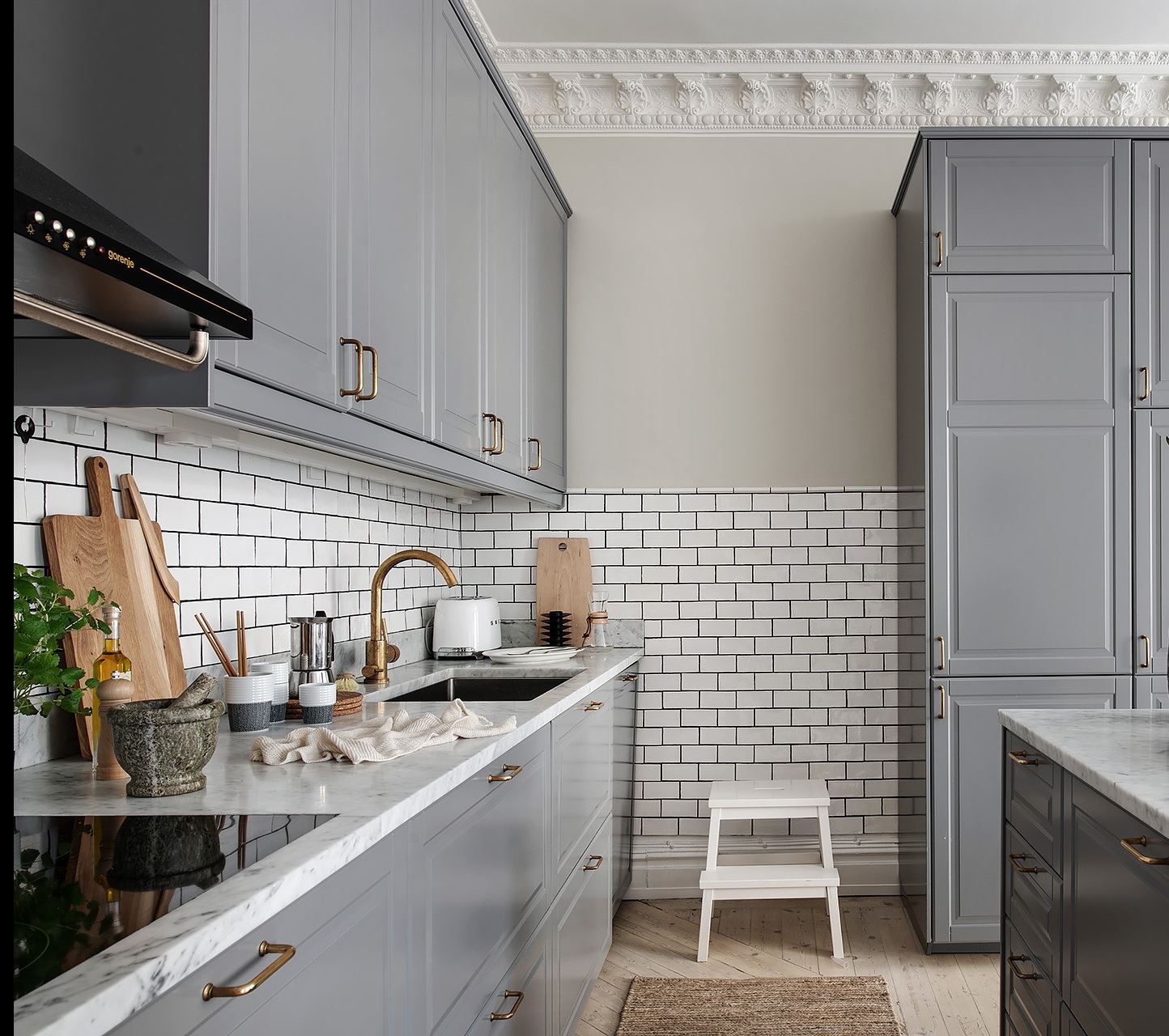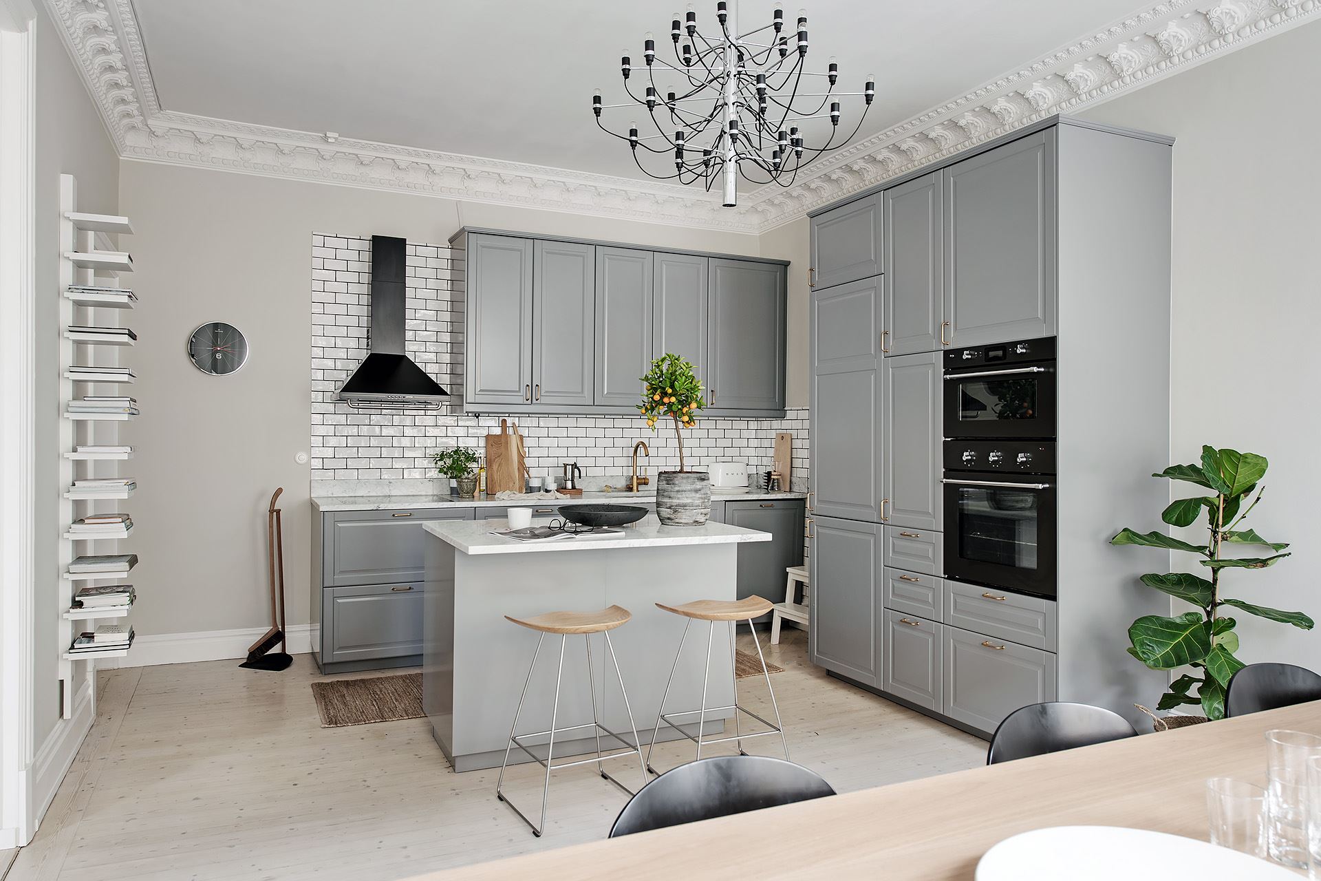 화이트 타일로 견고하게 마감된 백스플래쉬로 사용의 편리를 더한 주방에는 상부장, 하부장, 홈바 겸 아일랜드 식탁, 수납장으로 구성된 빌트인 싱크대 세트를 설치해 공간을 효율적으로 활용한 주방 인테리어를 완성하고 있다.