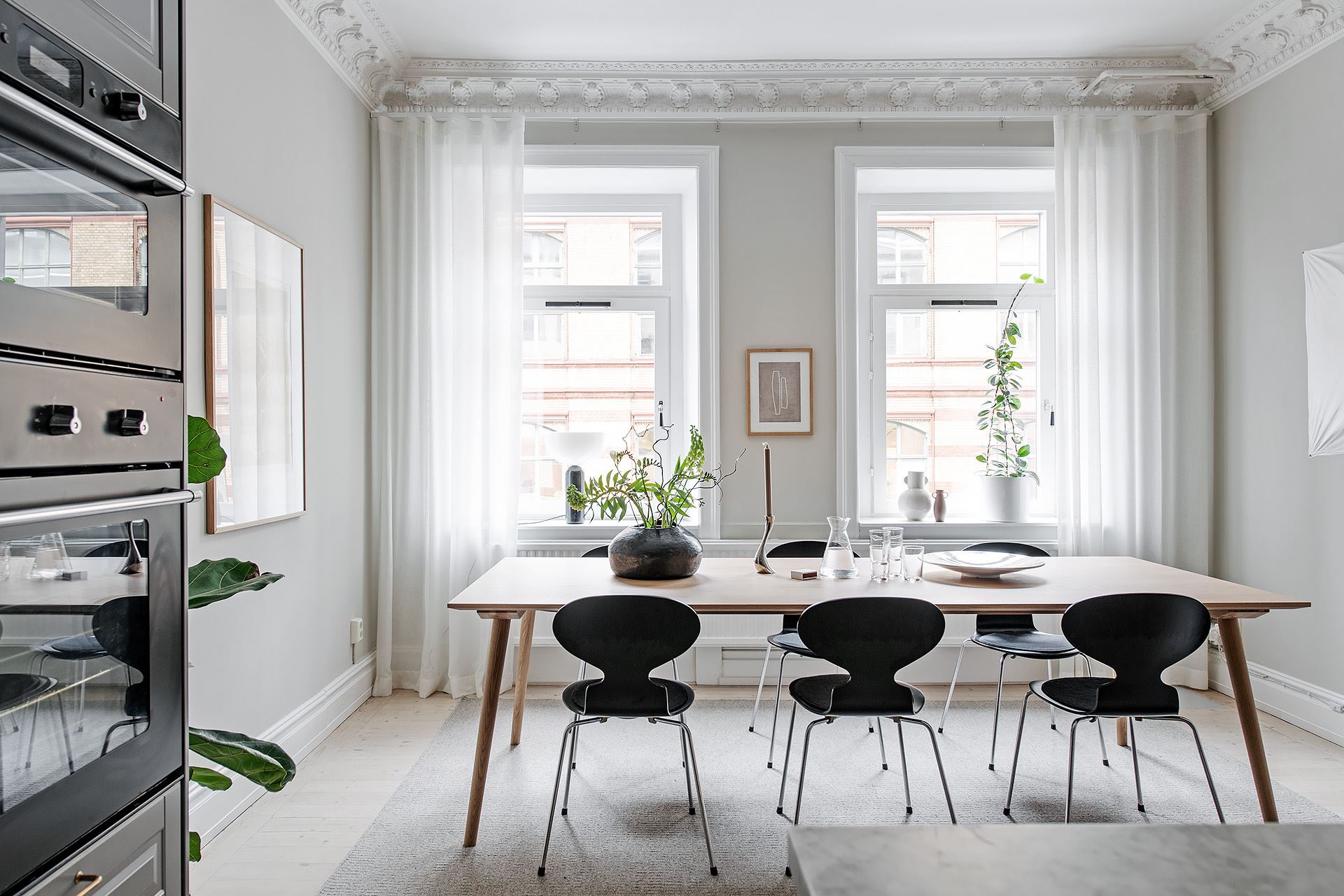 우드 다이닝 테이블과 블랙 다이닝 체어, 러그, 액자, 화초 등으로 꾸며진 다이닝 공간은 가족은 물론 친구, 지인들과 함께 식사와 티타임을 즐길 수 있는 우아한 홈 카페 겸 레스토랑으로 디자인되어 일상의 여유와 낭만을 더하고 있다.