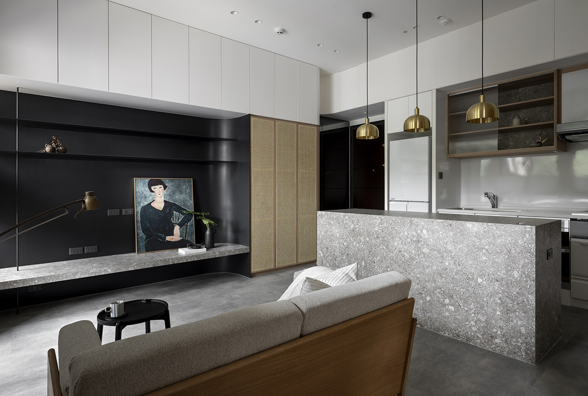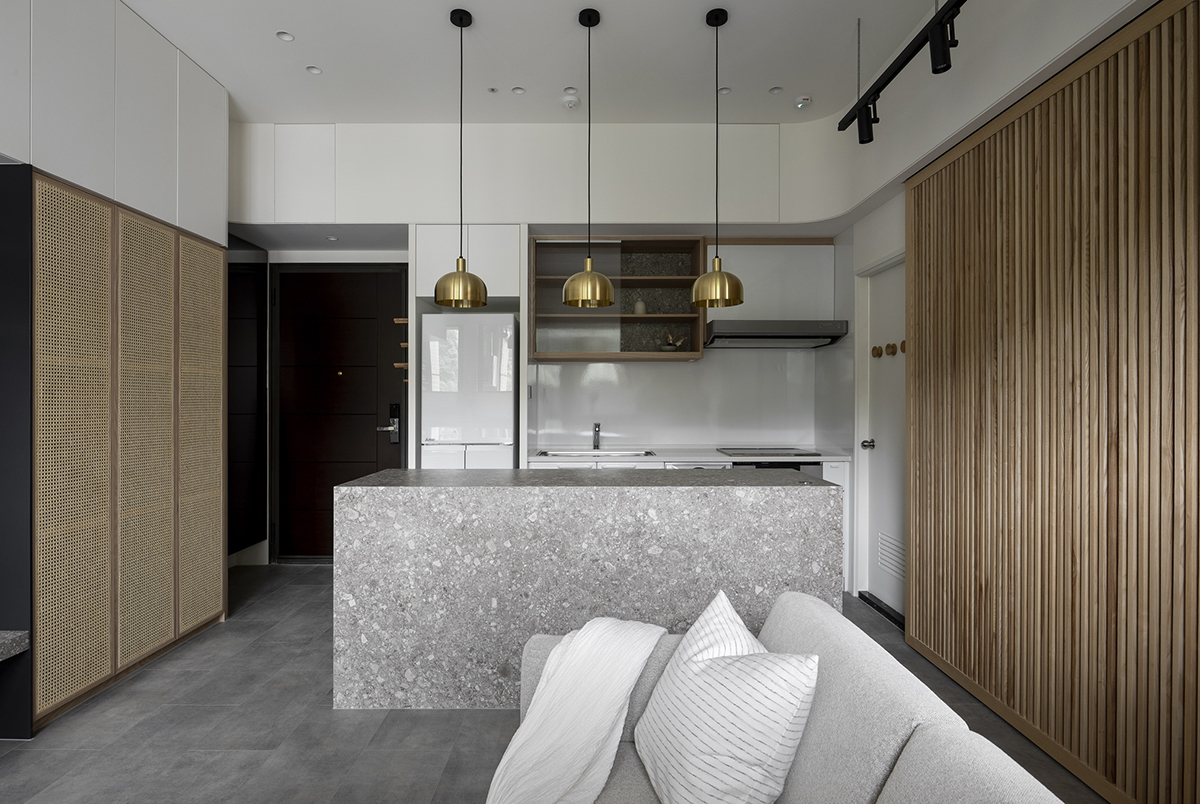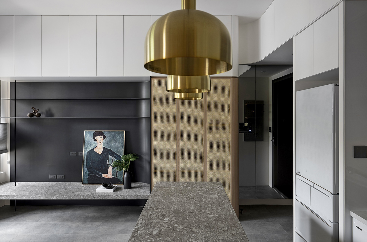 요리를 좋아하는 집주인을 위해 특별히 디자인된 대면형 주방의 경우 싱크대와 테라조 아일랜드, 주방 가전을 깔끔하게 배치한 후, 골드 펜던트 조명으로 포인트를 줘 소형 주방 공간에 적용해 볼 수 있는 고급스럽고 실용적인 모던 키친을 연출하고 있다.