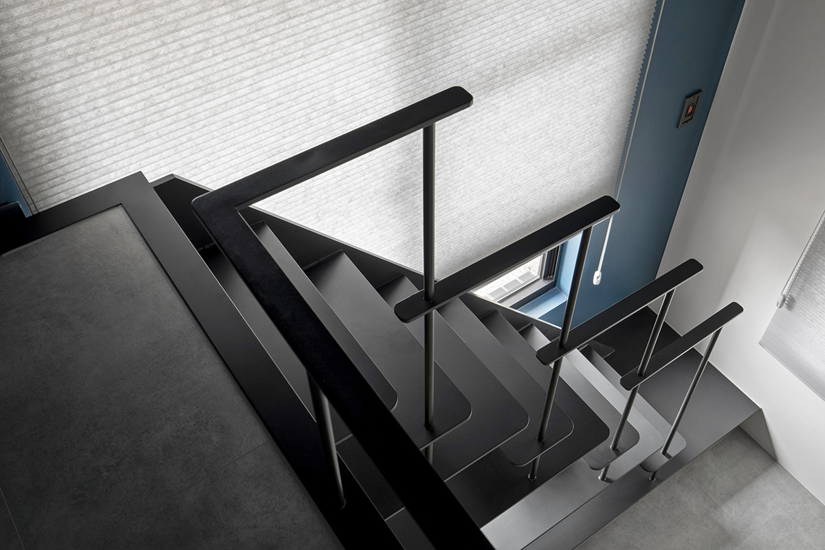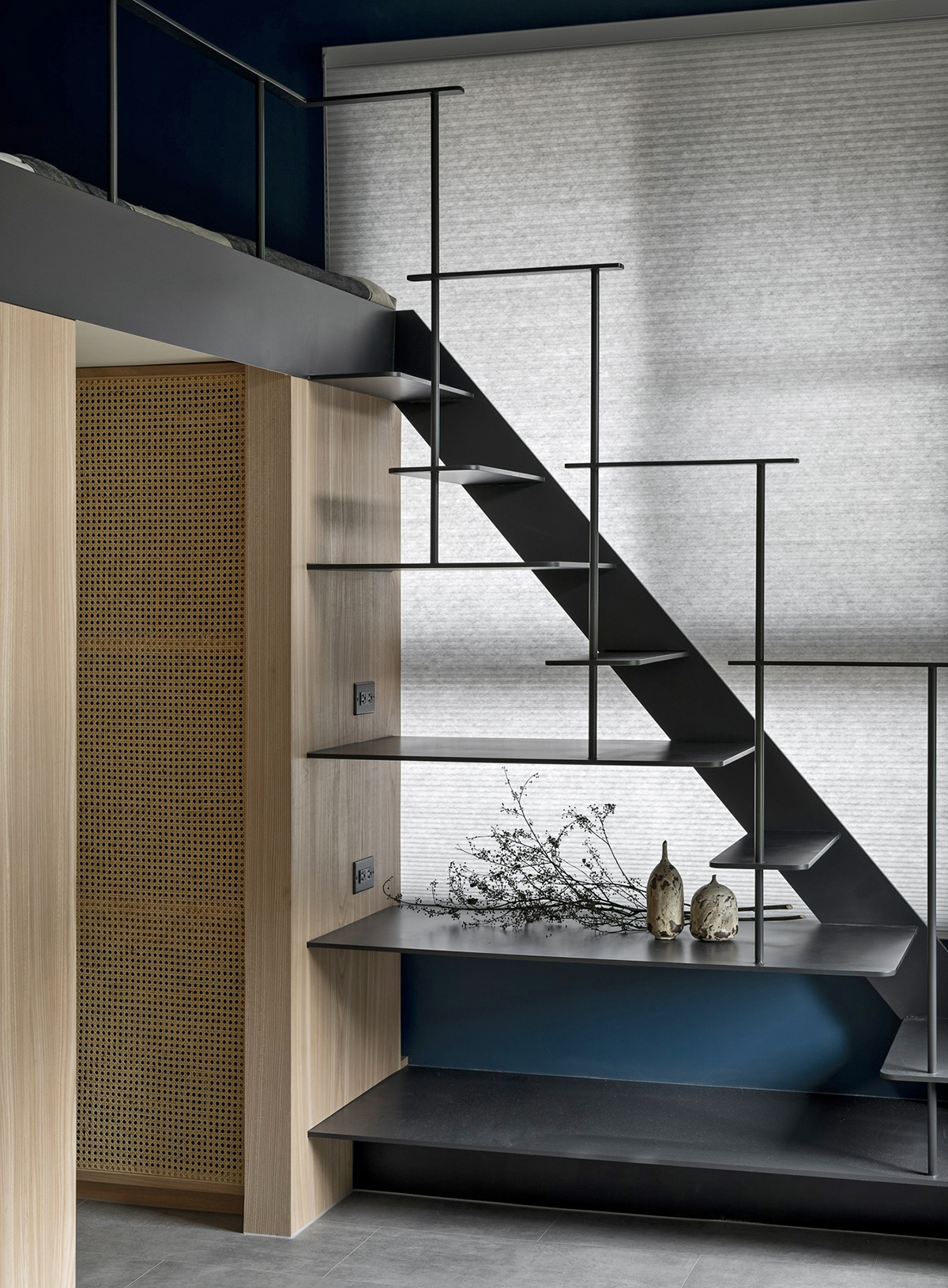 얇고 가볍지만 튼튼한 철제 계단으로 이어지는 복층은 편안한 수면을 위한 공간으로, 계단과 같은 소재의 튼튼한 철제로 난간을 설치해 안전에 각별히 신경 썼다.