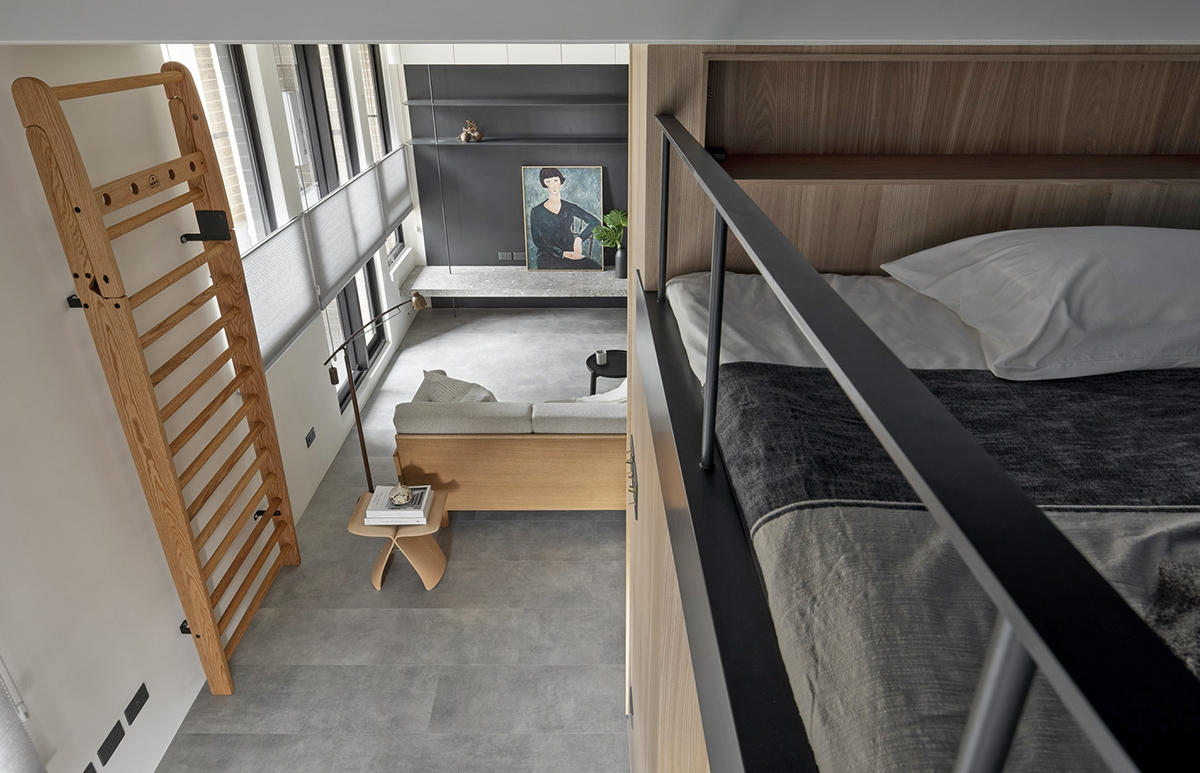 일본식 미닫이문을 차용해 만든 원목 슬라이딩 도어가 설치되어 거실과 주방이 있는 메인 공간과 자연스럽게 연결, 분리되는 프라이빗 공간의 경우 홈 오피스 겸 작업실과 드레스룸이 있는 메인층과 수면 공간이 있는 복층이 효율적으로 자리하고 있어 작은 공간을 활용한 알찬 공간 디자인을 잘 보여주고 있다.