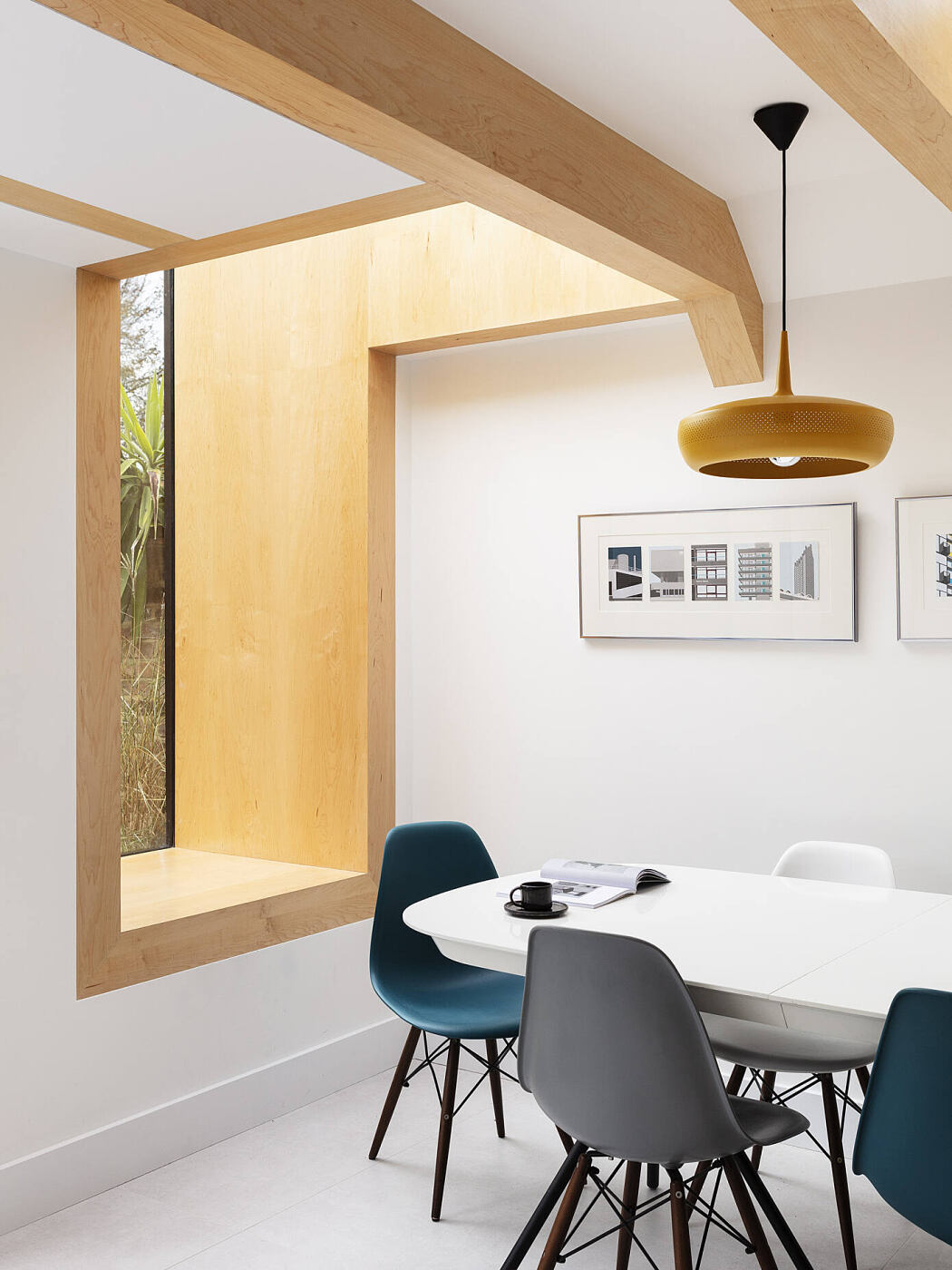 화이트 컬러와 원목, 옅은 그레이 포세린 타일이 조화롭게 어우러져 따뜻하고 세련된 분위기를 연출하고 있는 주방 겸 다이닝 공간에는 대형 슬라이딩 도어와 전면 창문, 천장 창문이 설치해 원활한 채광, 환기, 통풍을 가능케 했다.