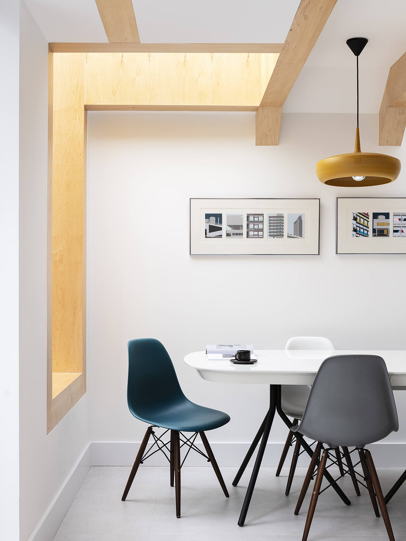다채로운 컬러의 다이닝 체어들이 놓인 6인용 다이닝 테이블 세트로 꾸며진 다이닝 공간은 식사와 티타임은 물론 휴식과 여가, 업무와 학습 공간으로도 사용할 수 있는 홈 카페 스타일로 예쁘게 디자인되어 가족의 일상을 더욱 풍요롭게 해준다.