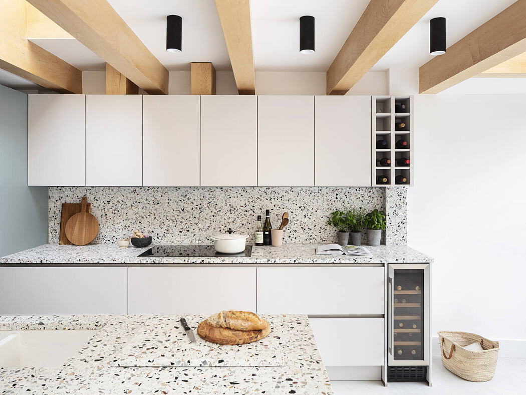 테라조로 카운터탑과 백스플래쉬에 포인트를 준 심플하고 세련된 디자인의 빌트인 싱크대가 설치된 대면형 주방의 경우 싱크대와 조리대를 겸하고 있는 넉넉한 사이즈의 아일랜드로 사용의 편리를 더했다.
