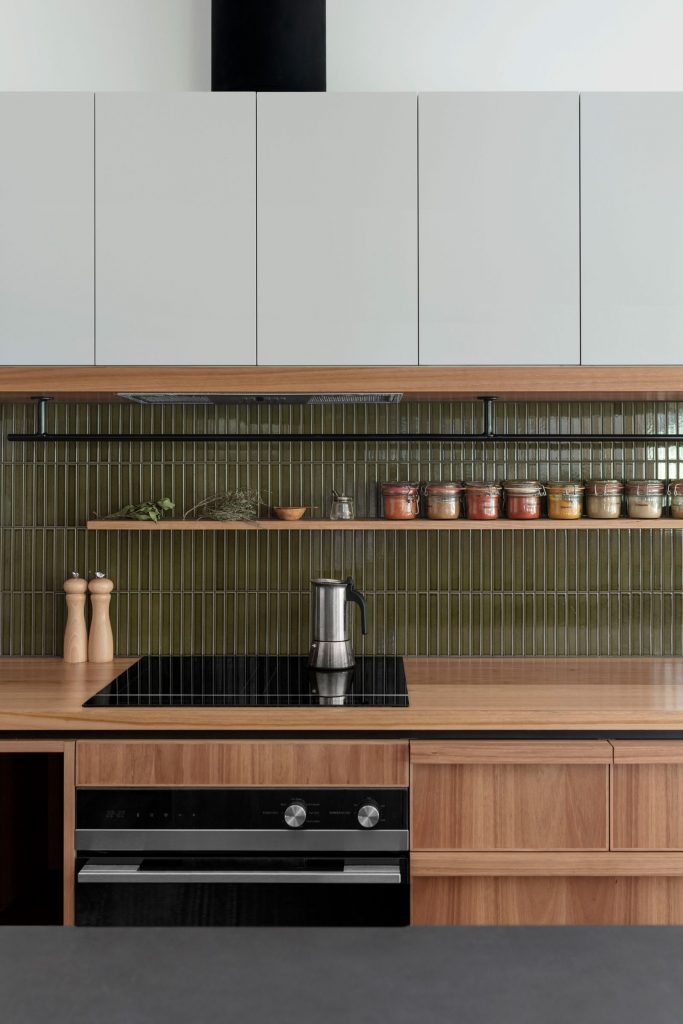 원목으로 제작된 맞춤 빌트인 싱크대와 백스플래쉬를 견고하게 마감하고 있는 올리브 타일이 어우러져 우아하고 세련된 공간감을 선사하는 대면형 주방은 실용적인 구성과 효율적인 동선이 돋보이는 아름답고 실용적인 주방공간을 완성하고 있다.