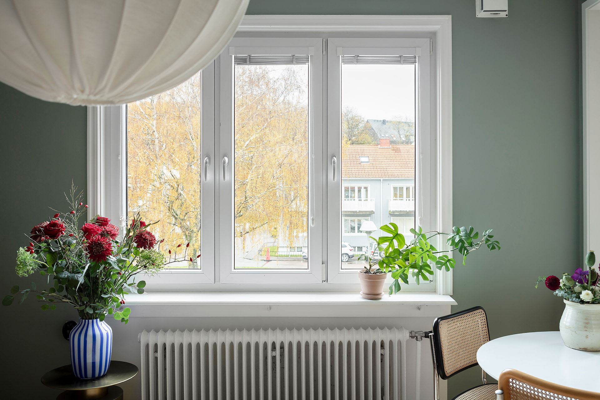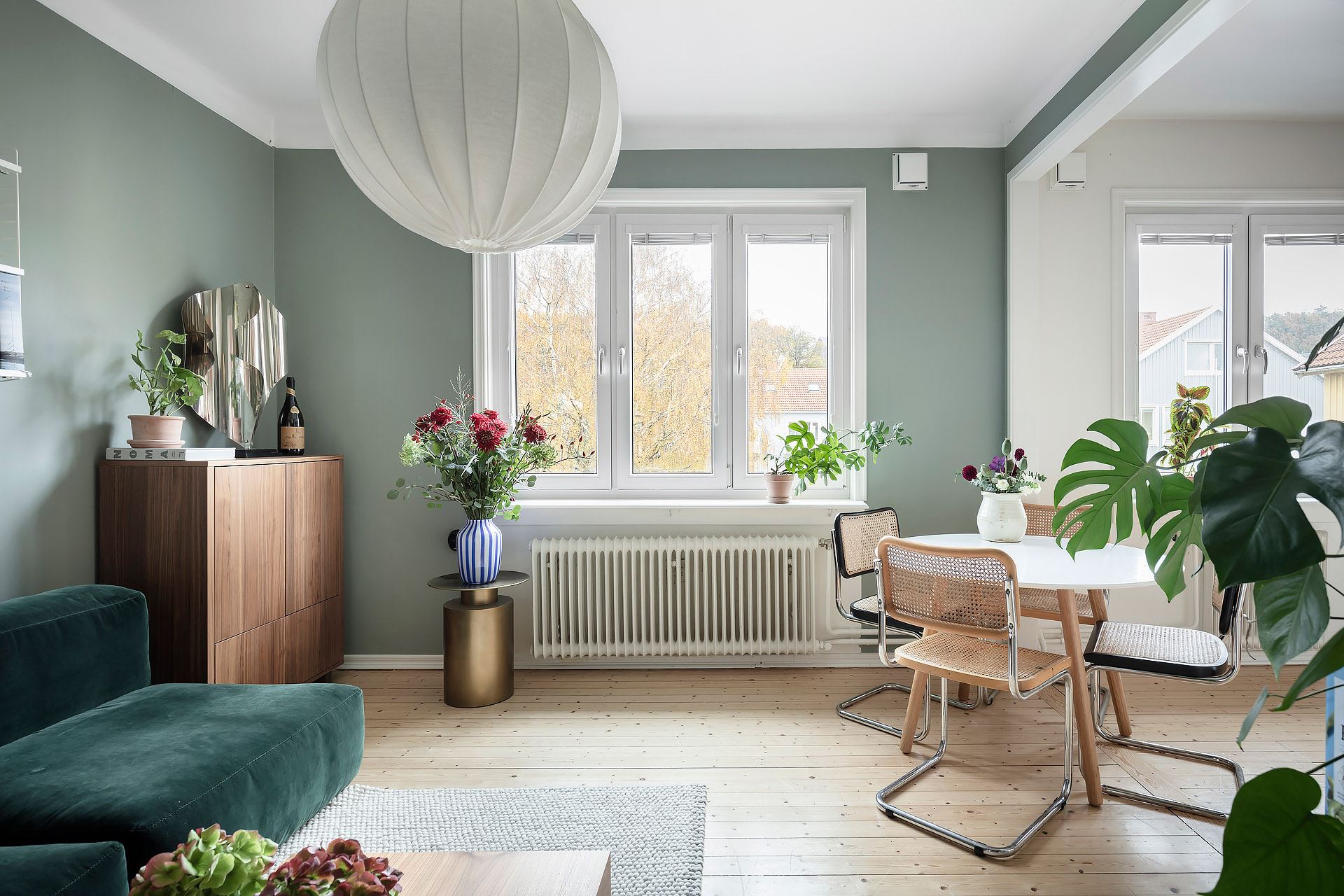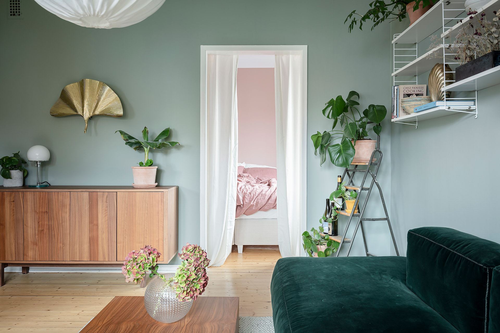 제이드 컬러와 부드럽게 어우러지는 그린 벨벳 소파를 중심으로 티 테이블, 거실장, 선반장, 러그, 조명, 액자, 오브제 들을 안정감 있게 배치한 후, 다양한 종류의 화초들로 싱그러운 포인트를 준 거실은 편안한 휴식 공간으로 예쁘게 디자인되었다.