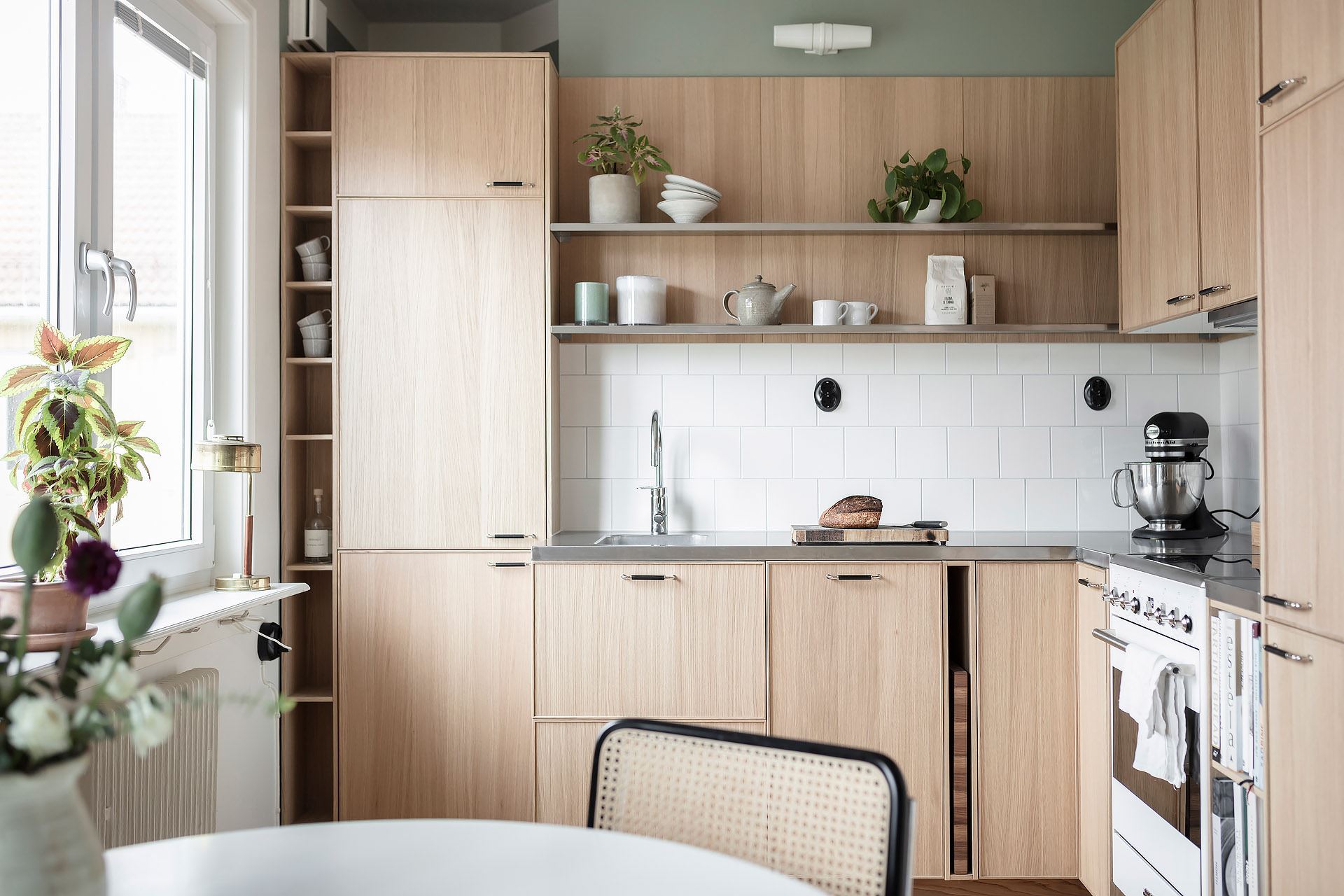 화이트 타일로 깔끔하게 마감된 백스플래쉬로 사용과 관리에 편리를 더한 주방에는 스테인리스 스틸로 제작된 카운터 탑이 놓인 심플한 디자인의 원목 싱크대와 주방 가전을 깔끔하게 설치해 작은 주방 공간을 효율적으로 활용한 세련된 주방 인테리어를 잘 보여주고 있다.