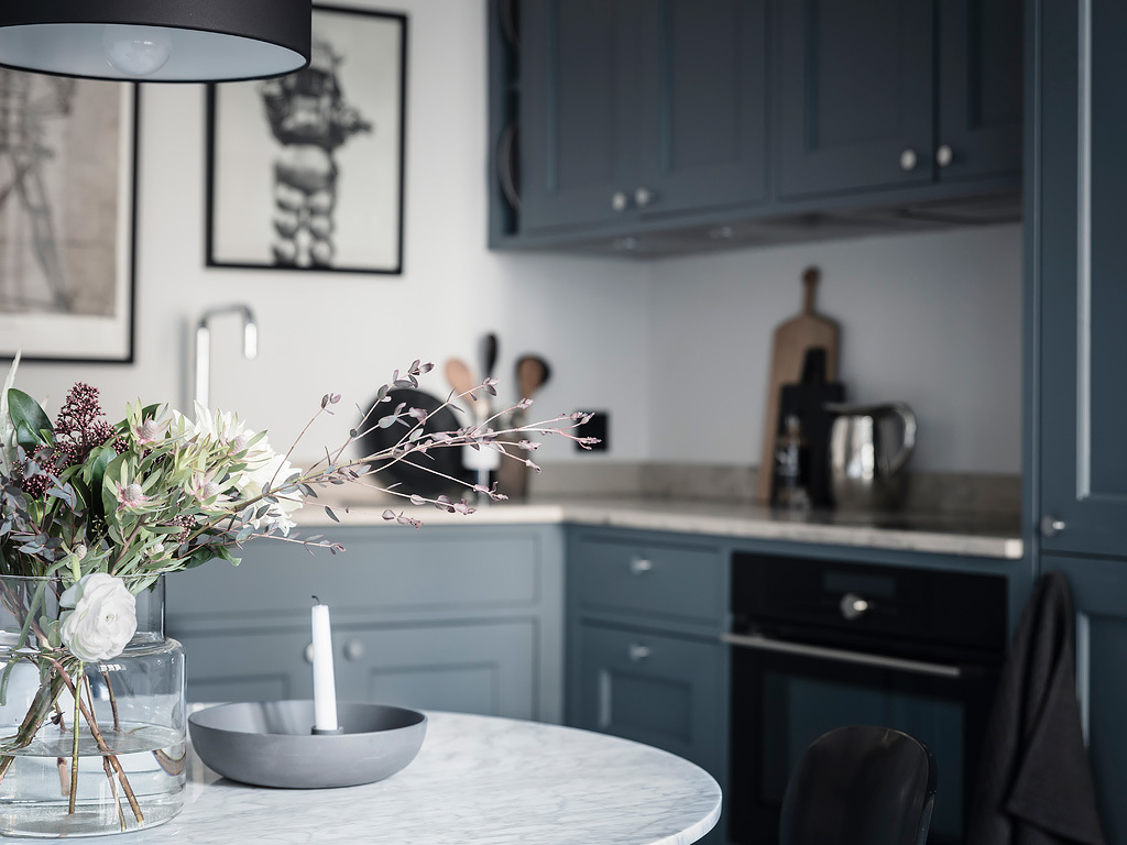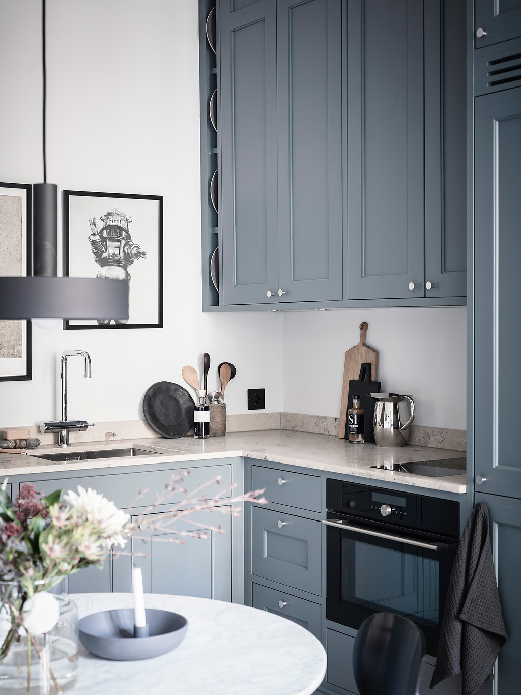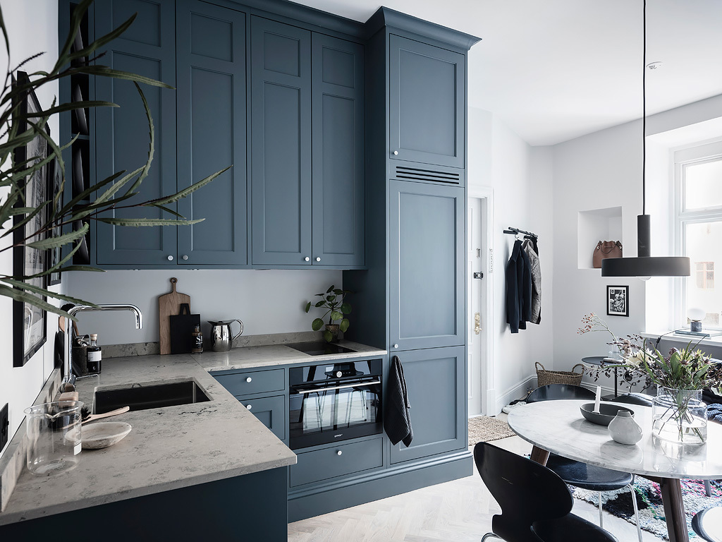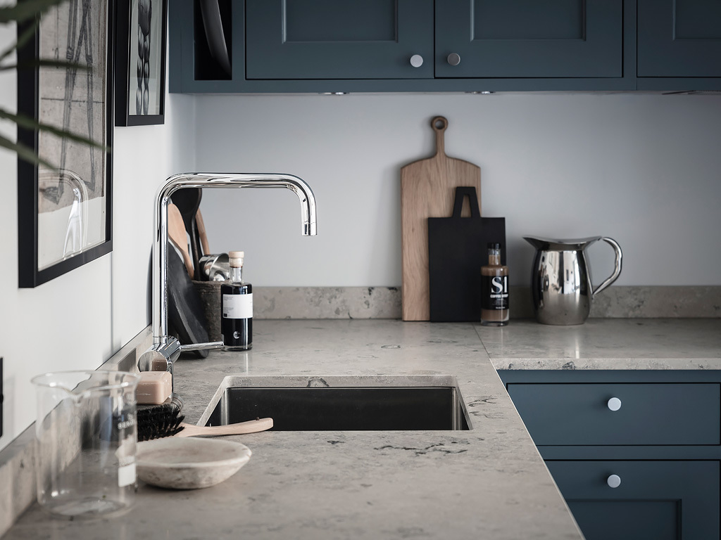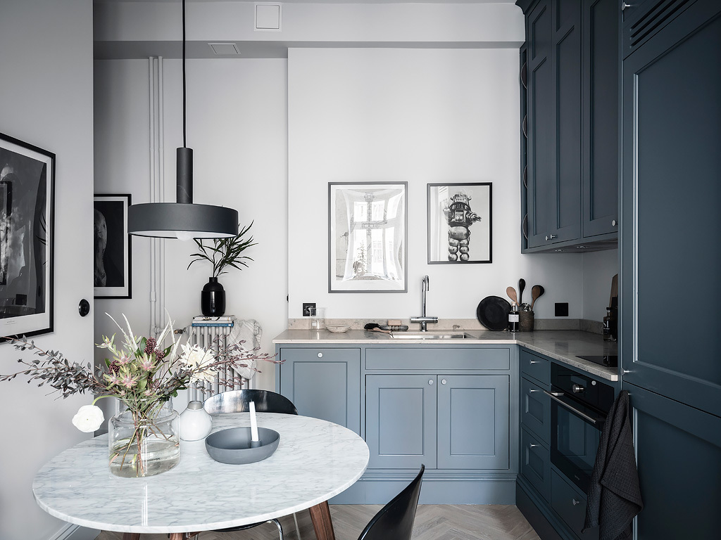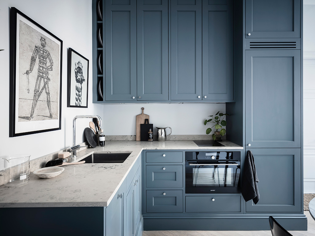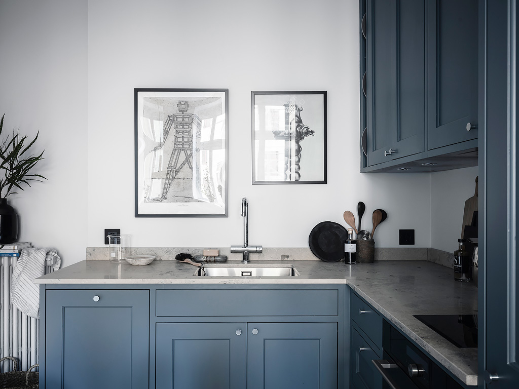 대리석 카운터 탑으로 고급스럽게 마감된 블루 빌트인 싱크대가 설치된 주방은 아름답고 실용적인 디자인으로 이 집을 더욱 특별하게 만들어준다.