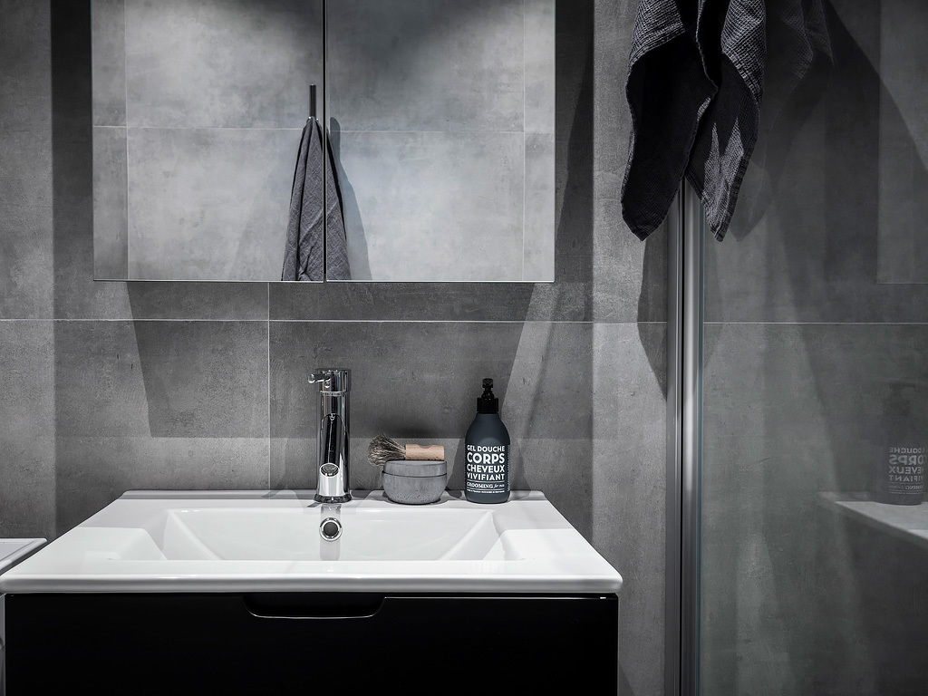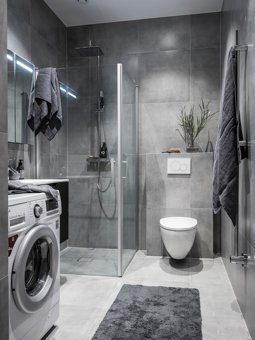 그레이 타일로 견고하게 마감된 욕실 겸 세탁실에는 샤워공간과 세면, 세탁 공간이 깔끔하게 구분될 수 있도록 투명한 글라스 샤워부스를 설치해 사용과 관리에 편리를 더했다.