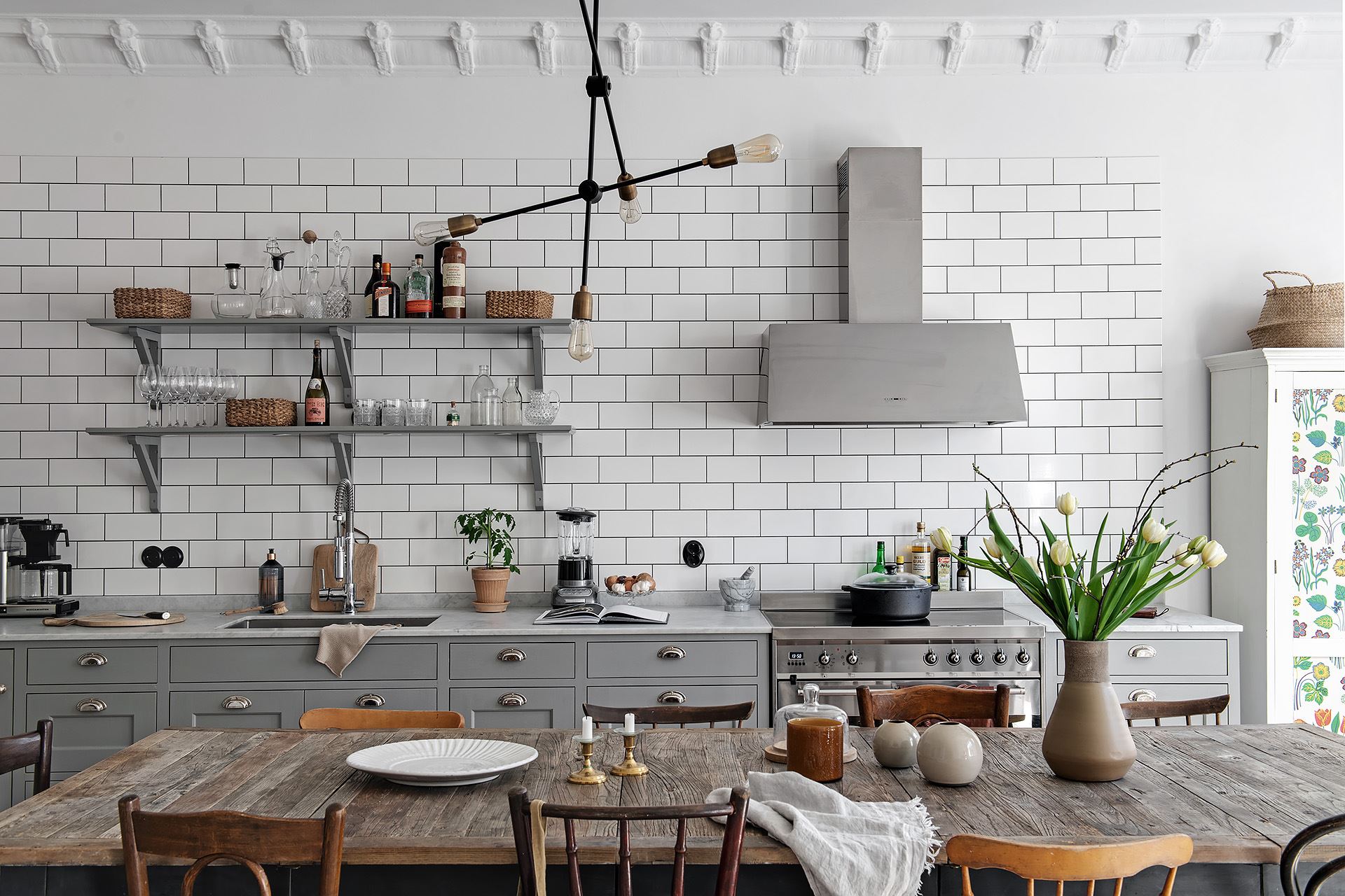 화이트 타일로 견고하게 마감된 백스플래쉬로 깔끔함을 더한 주방에는 상부장을 과감하게 생략하고 대리석 카운터 탑이 놓인 고급스러운 그레이 하부장과 선반장을 함께 설치해 시각적으로 넓고 시원한 주방 공간을 선보이고 있다.