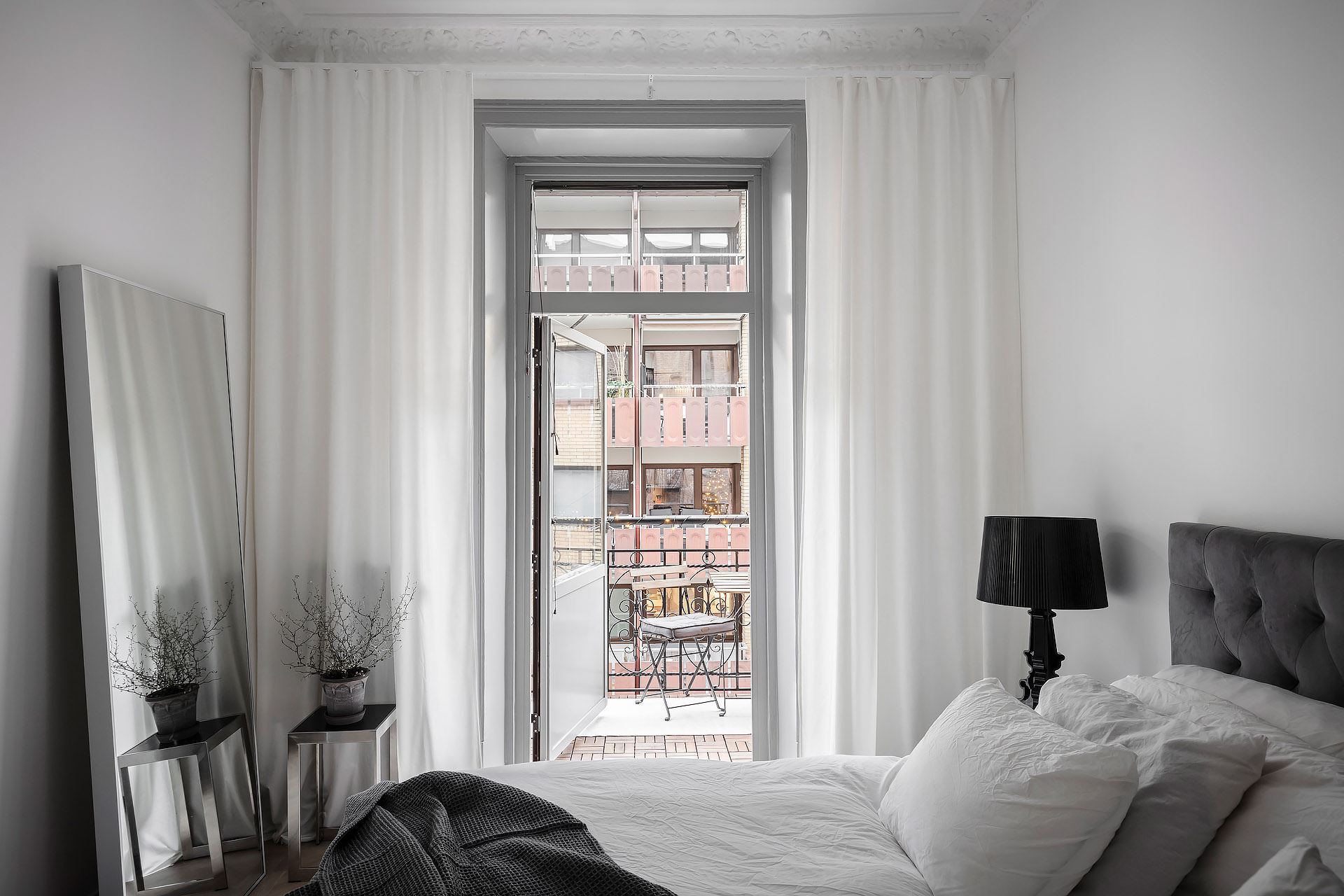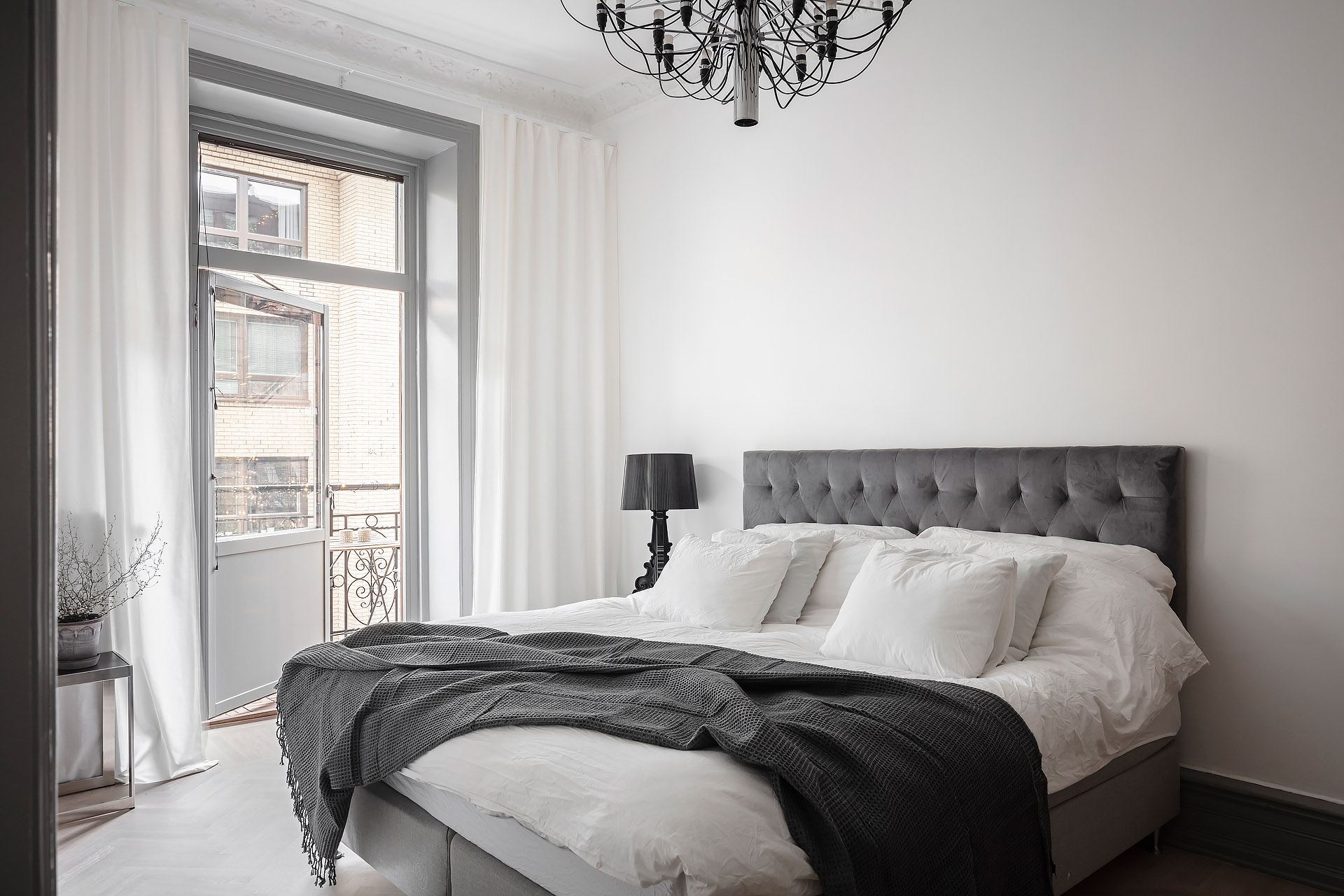 홈 카페 스타일로 디자인된 예쁜 발코니가 있는 마스터 침실은 화려함과 심플함이 공존하는 럭셔리한 모던 클래식 스타일로 디자인되어 전체 공간과 조화로운 우아하고 품격 있는 침실 공간을 연출하고 있다.