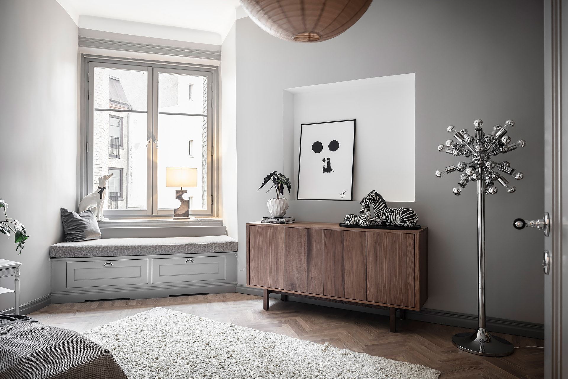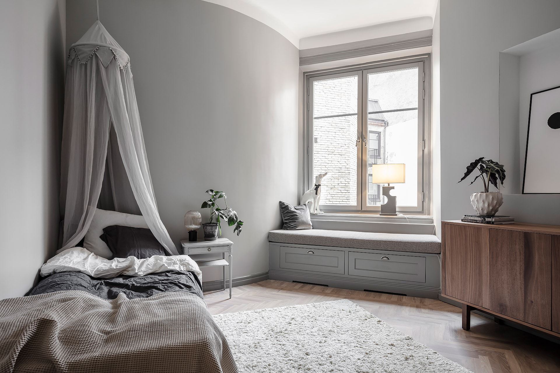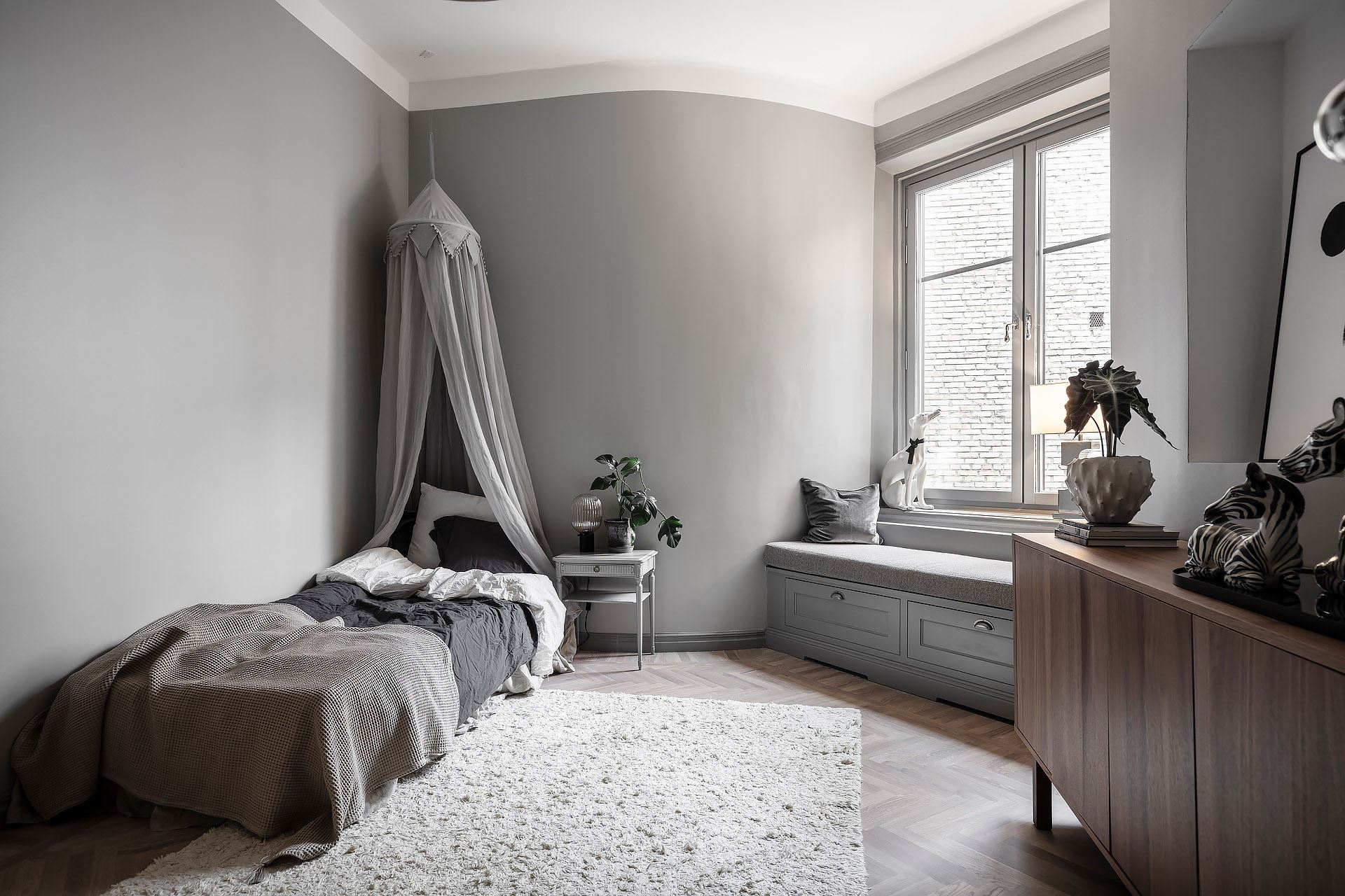 화이트와 그레이 컬러로 차분한 분위기를 연출하고 있는 아이 침실에는 캐노피로 포인트를 준 싱글 사이즈의 침대와 휴식과 여가를 즐길 수 있는 편안한 윈도우 시트, 심플한 디자인의 우드 수납장 등이 조화롭게 배치되어 정갈하고 세련된 침실 인테리어를 완성하고 있다.