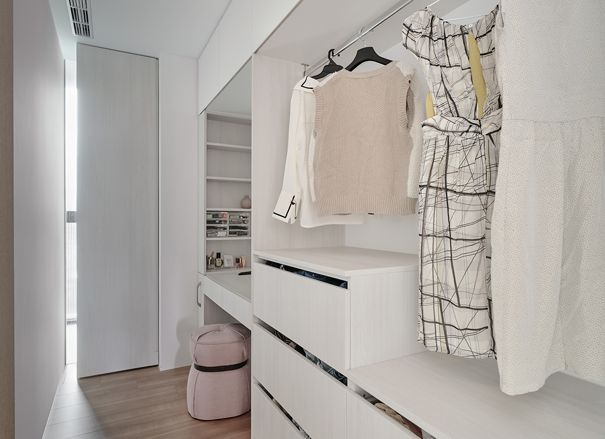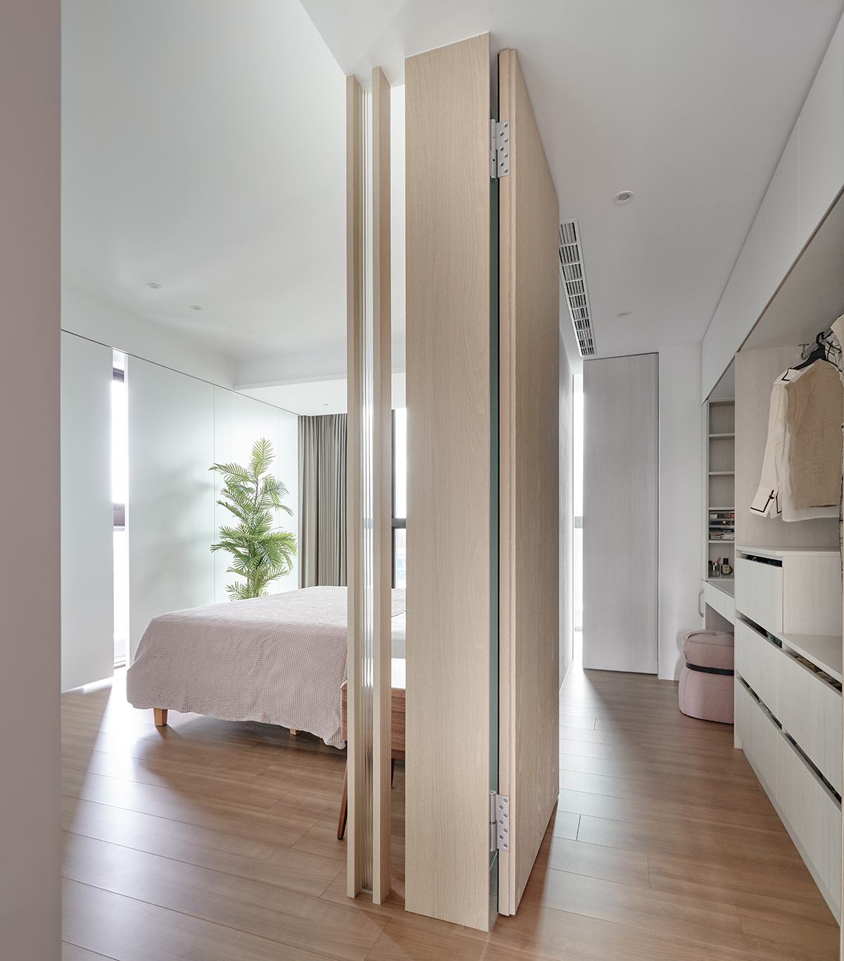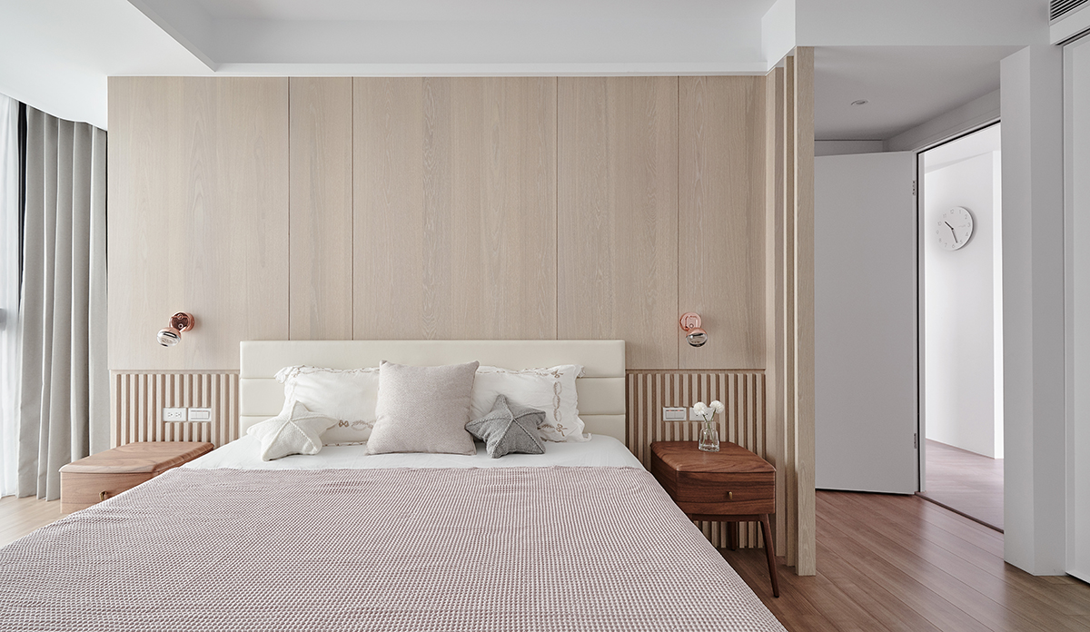 부드럽고 은은한 분위기를 연출하는 화이트우드 인테리어가 매력적인 부부 침실은 부부를 위한 편안하고 아늑한 안식처로 디자인되어 일상의 만족을 더하고 있다.