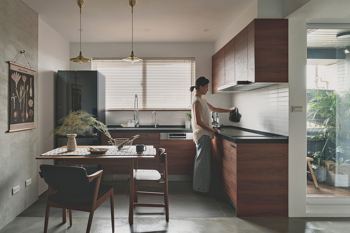 화이트 타일로 백스플래쉬를, 어두운 포세린 타일로 플로어를 시공해 뜨거운 기름과 연기로 인한 벽면과 바닥의 손상을 최소화한 주방에는 블랙 카운터탑으로 마감된 L자 형태의 원목 빌트인 싱크대와 블랙 냉장고를 깔끔하게 설치해 전체 공간과 조화롭게 어우러진 멋스러운 주방 공간을 선보이고 있다.