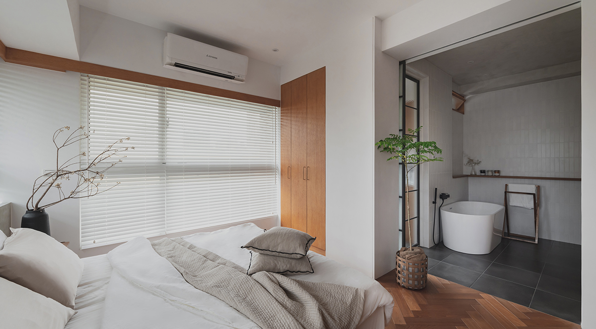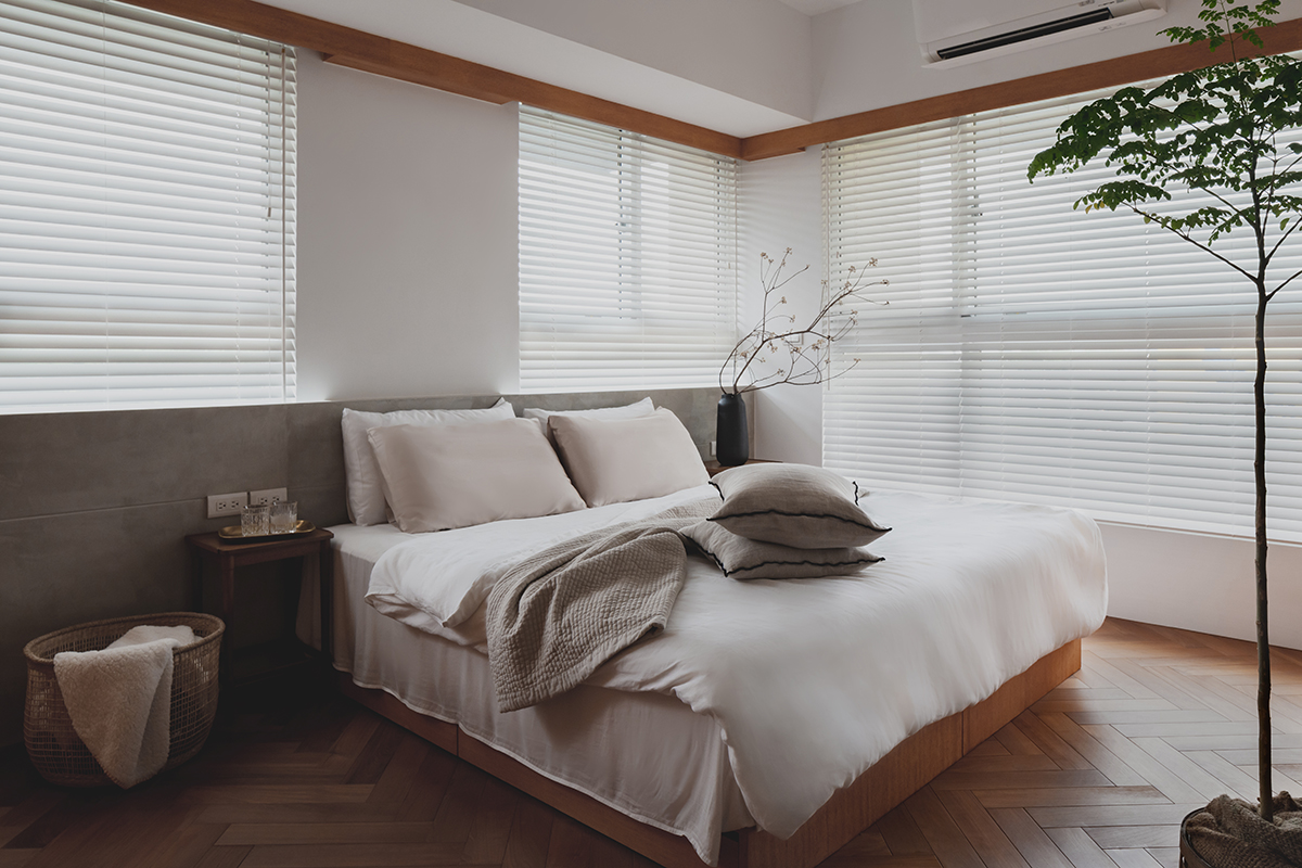 베네치아 블라인드 사이로 들어오는 은은한 자연채광, 슬라이딩 도어로 연결되는 넓은 전용 욕실, 새하얀 침구로 장식된 침대, 고급스러운 원목 빌트인장, 헤링본 원목 마루, 화초 등이 어우러져 이국적인 고급리조트의 스위트룸을 연상케 하는 마스터 침실은 금술 좋은 부부를 위한 품격 있는 프라이빗 공간을 잘 보여주고 있다.