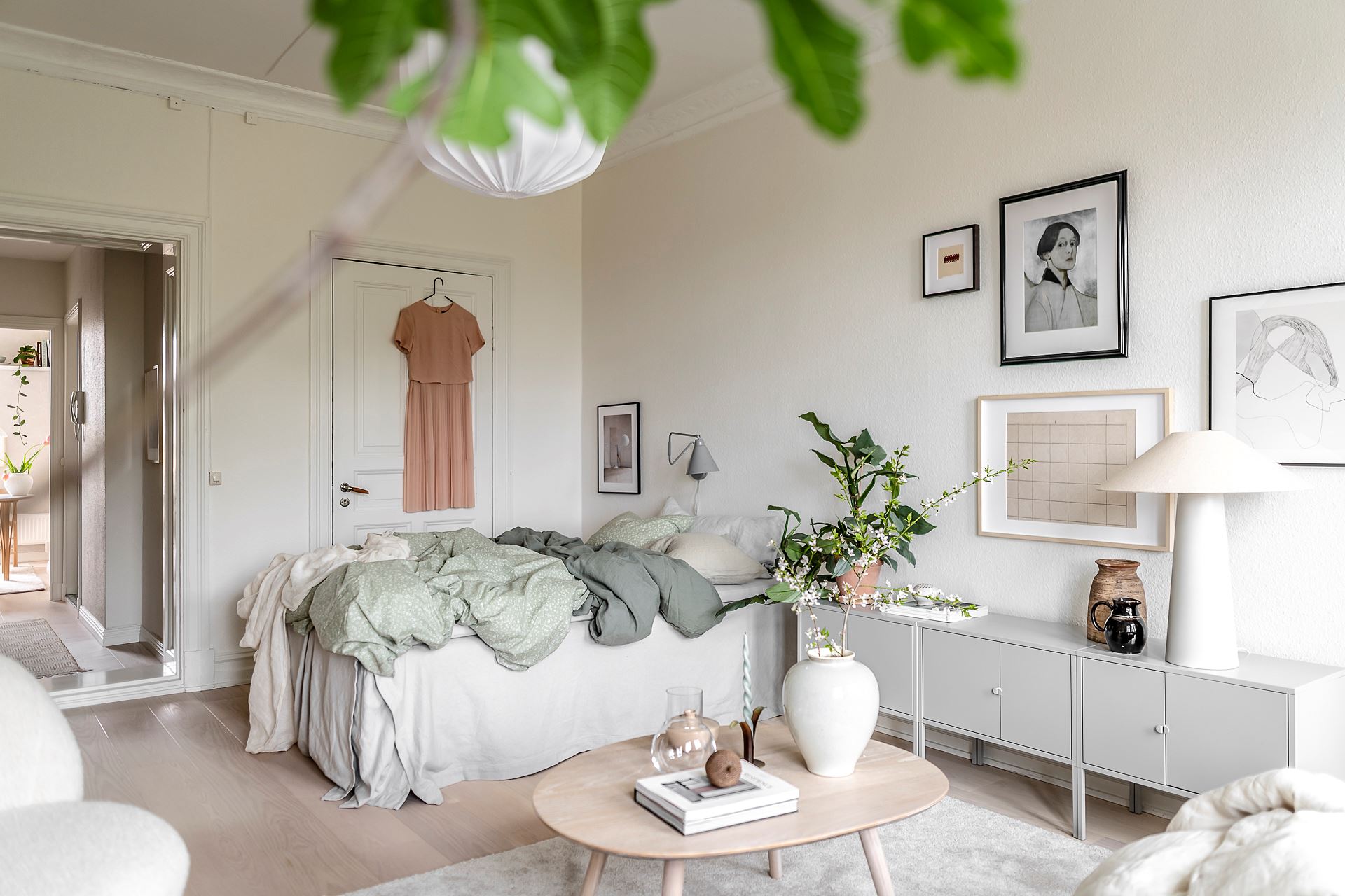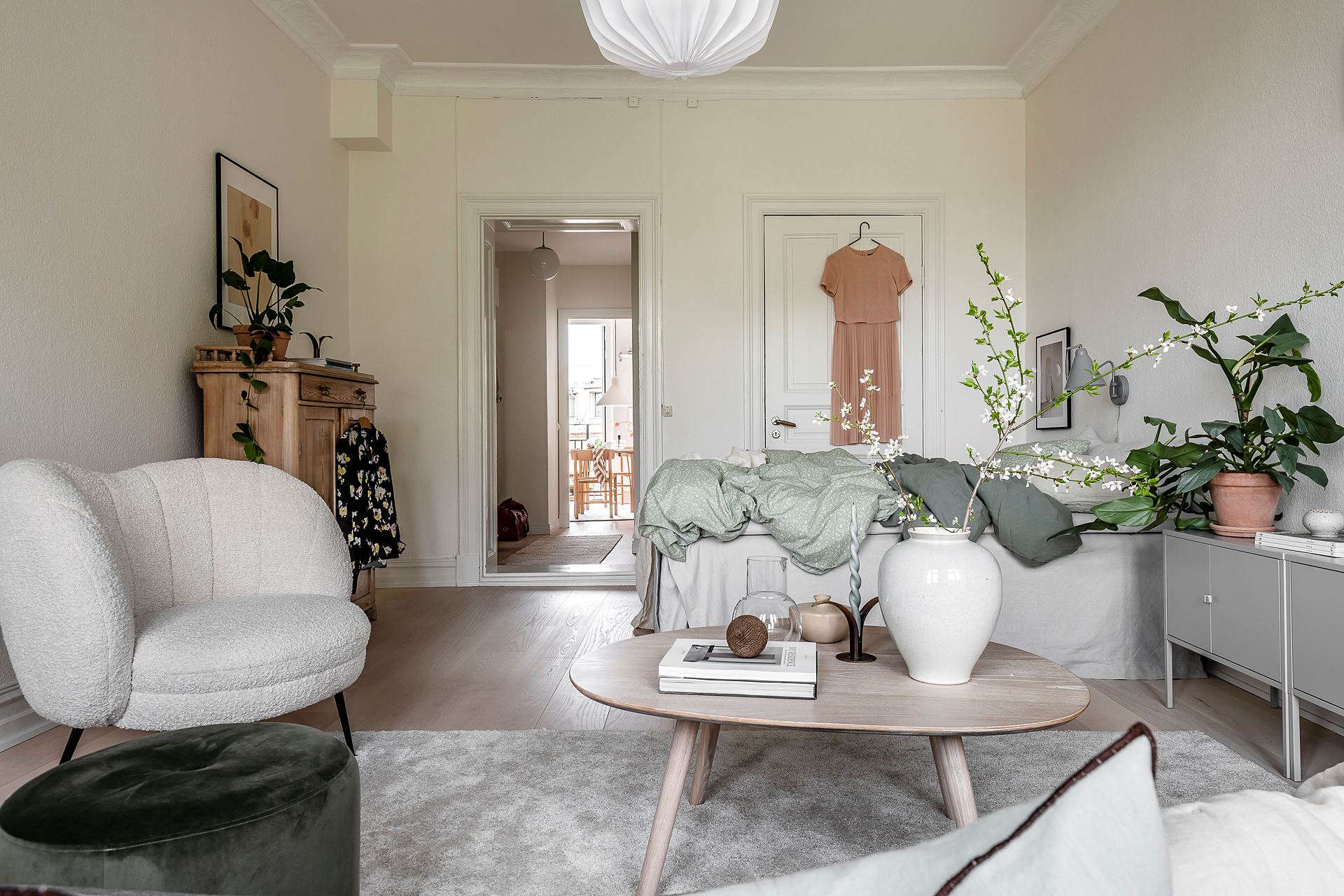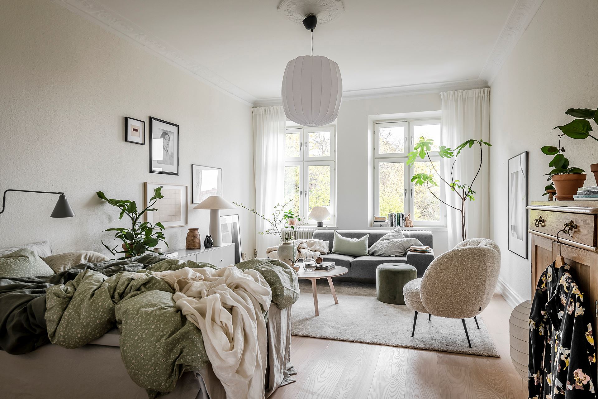 소파, 티 테이블, 라운지체어, 스툴, 수납장, 침대 등이 효율적인 동선에 맞춰 단정하게 배치된 거실 겸 침실 공간의 경우 러그, 커튼, 액자, 조명, 오브제, 화초 등으로 감각적인 포인트를 줘 아름답고 매력적인 공간을 완성하고 있다.