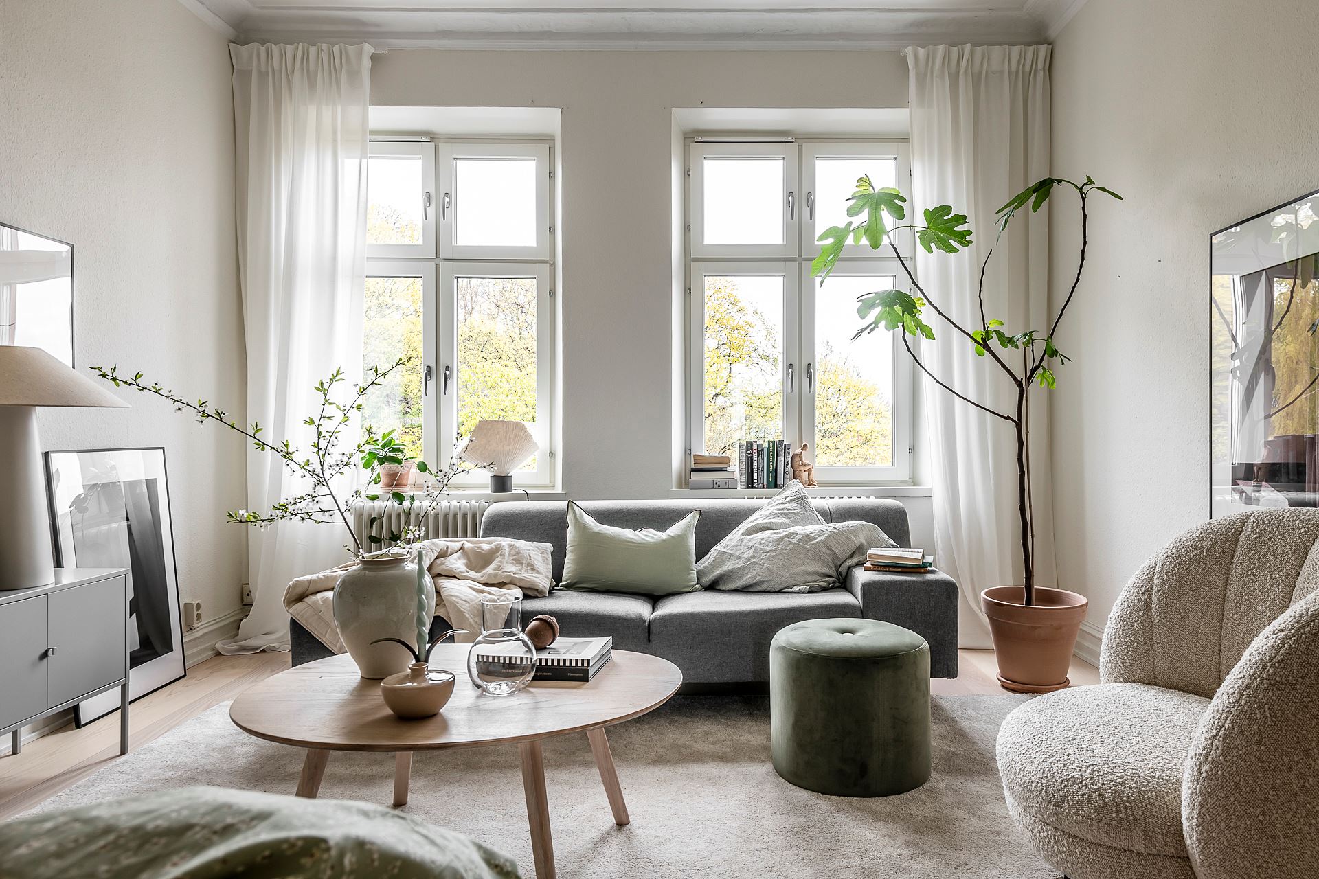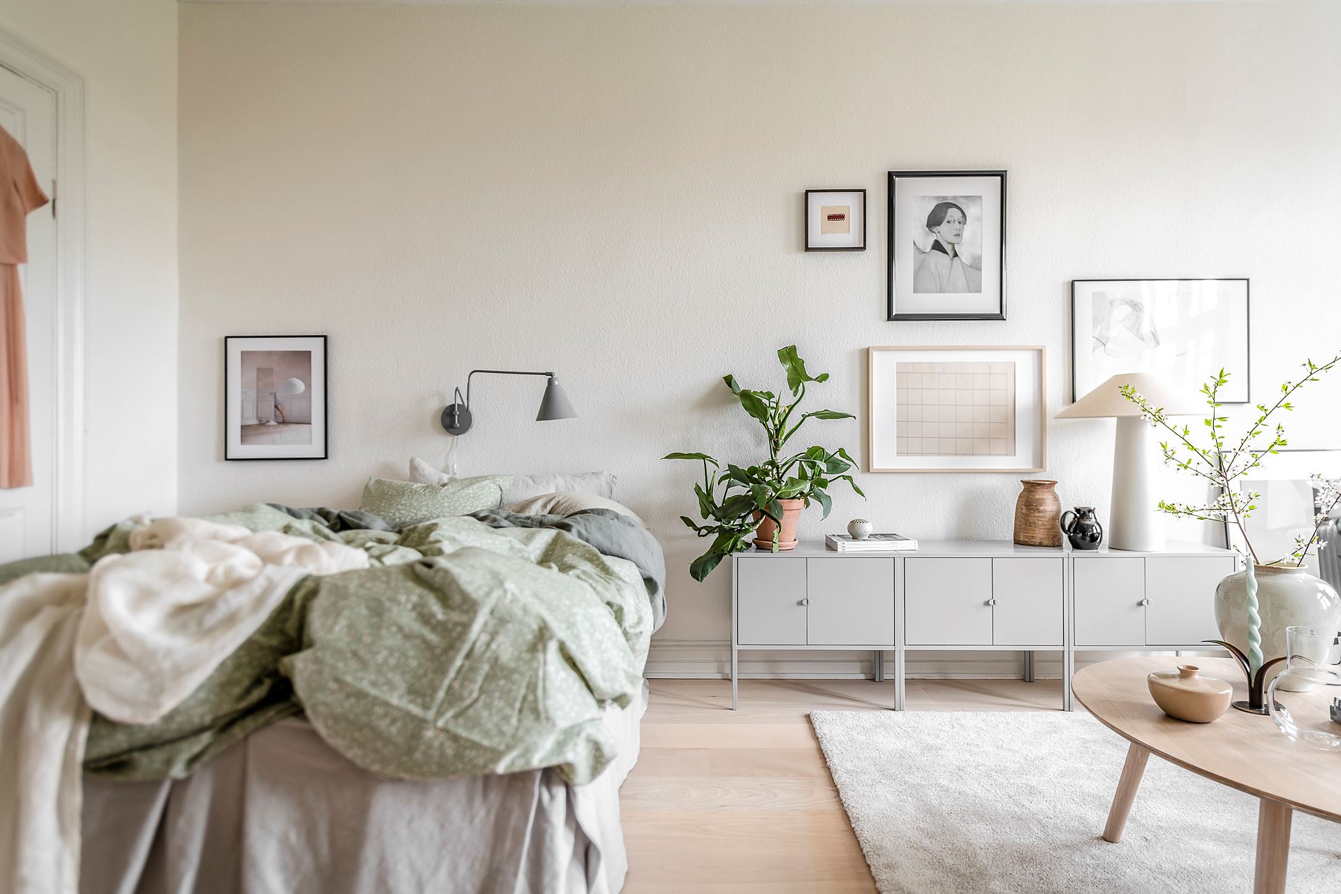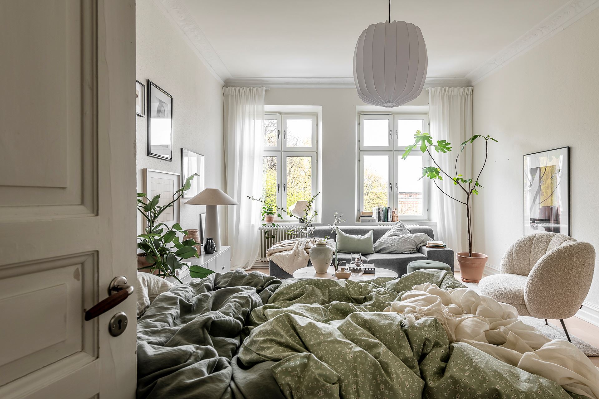 소파, 티 테이블, 라운지체어, 스툴, 수납장, 침대 등이 효율적인 동선에 맞춰 단정하게 배치된 거실 겸 침실 공간의 경우 러그, 커튼, 액자, 조명, 오브제, 화초 등으로 감각적인 포인트를 줘 아름답고 매력적인 공간을 완성하고 있다.