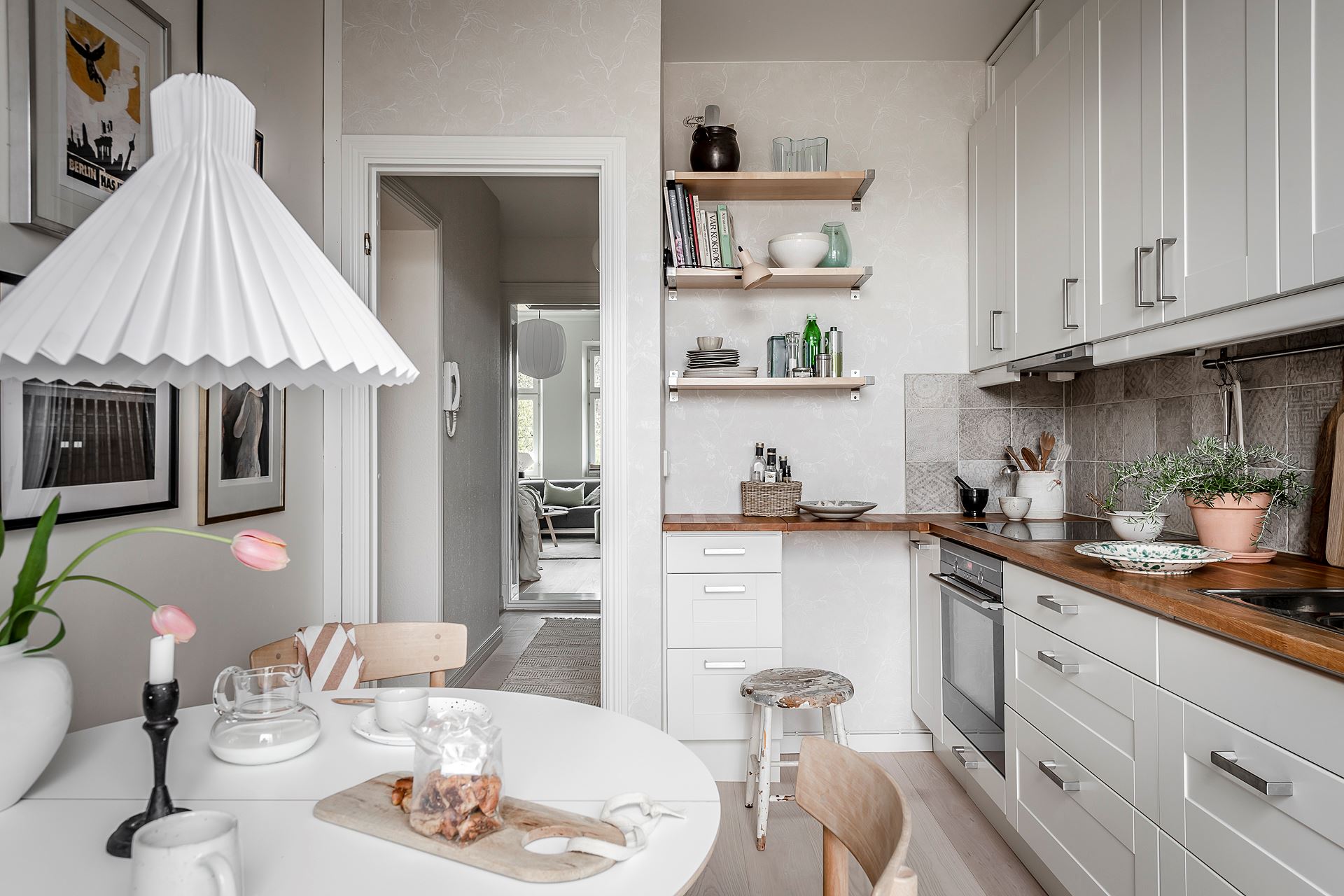 튼튼한 원목 상판이 놓인 그레이 싱크대와 선반, 주방 가전, 그레이 패턴 타일로 깔끔하게 마감된 백스플래쉬가 어우러진 주방은 소형 공간을 활용한 실용적인 모던 키친을 잘 보여주고 있다.