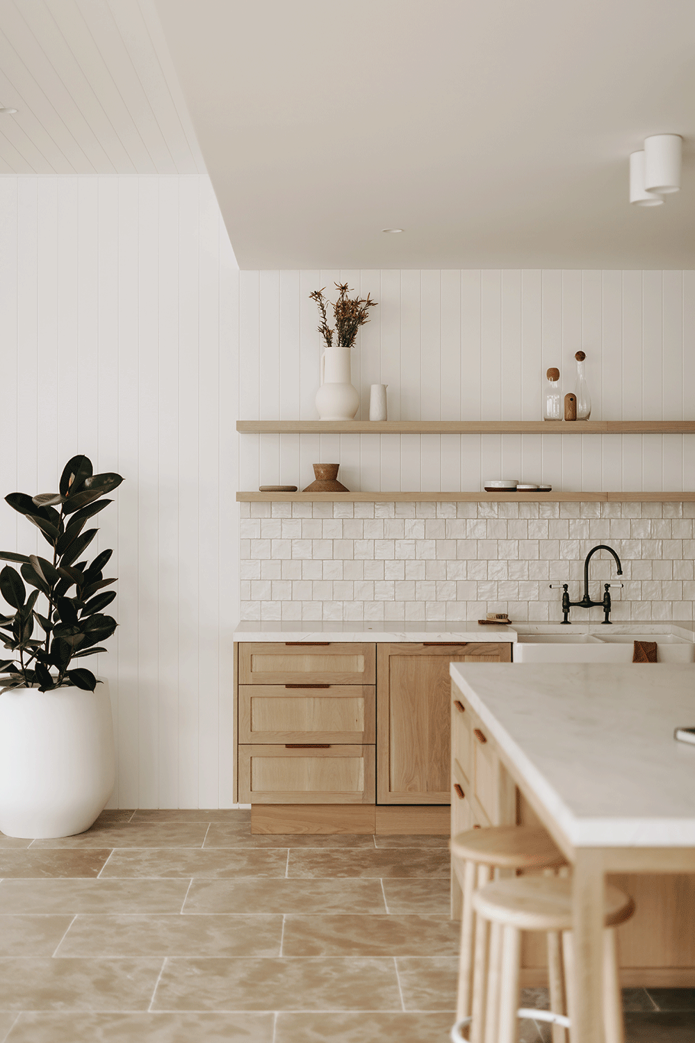 원목과 대리석으로 제작된 고급 빌트인 싱크대 세트가 설치된 상부장 없는 대면형 주방의 경우 모로코산 수제 젤리지 타일로 백스플래쉬를 견고하게 마감해 우아하고 세련된 주방 공간을 연출하고 있다.