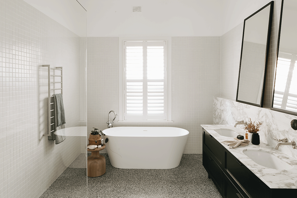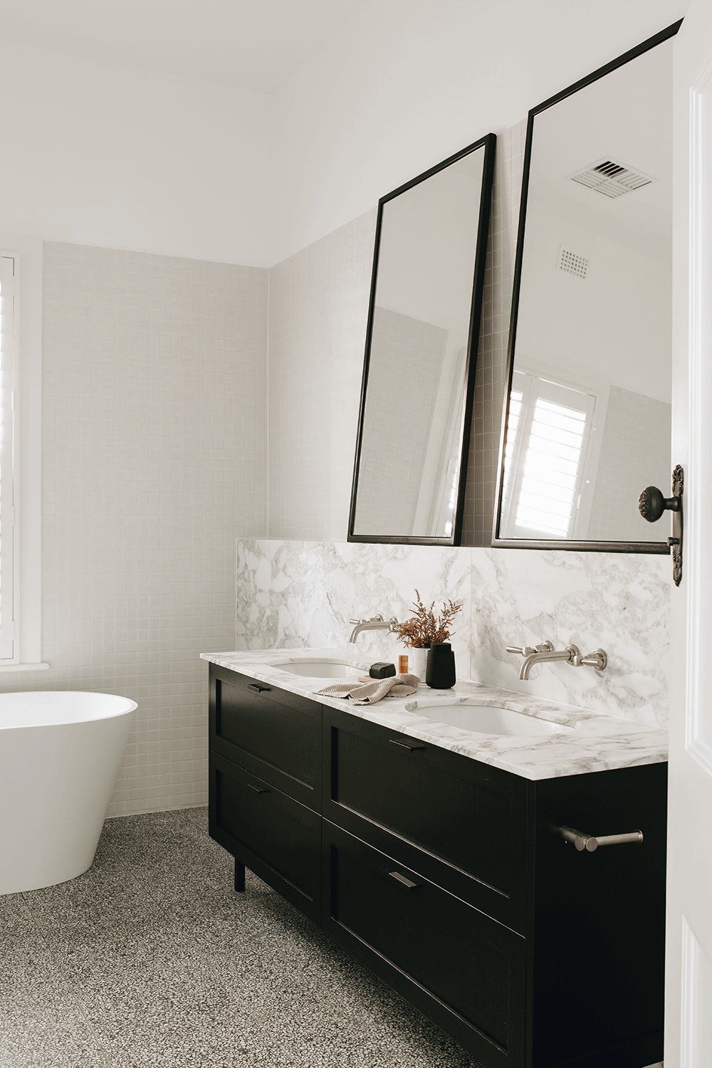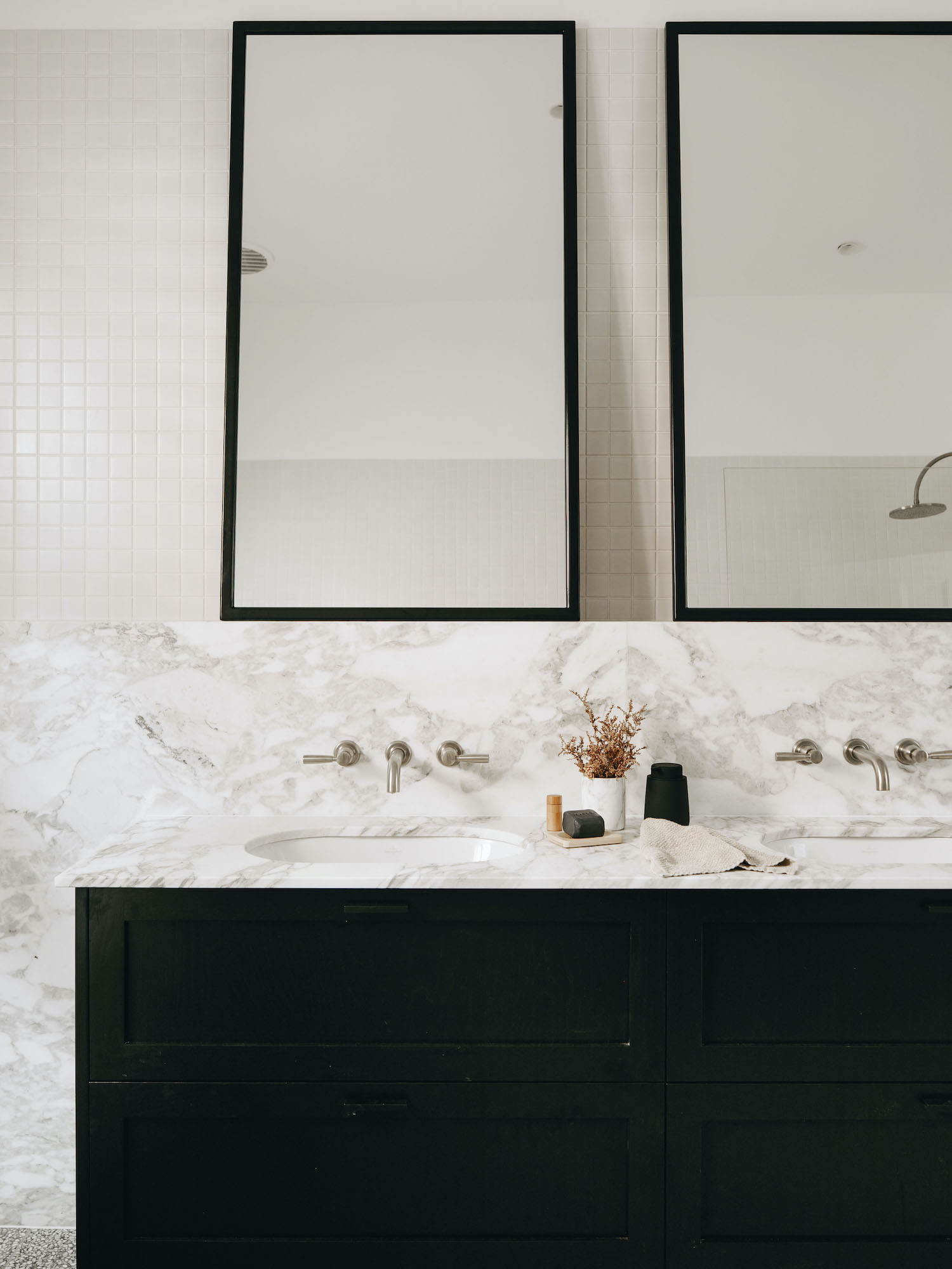 동양의 ‘음과 양’에서 영감을 받아 디자인된 정갈하면서도 품격 있는 건식 욕실은 고급 자재들로 견고하게 마감해 세련된 럭셔리 욕실 인테리어의 좋은 예를 보여주고 있다.