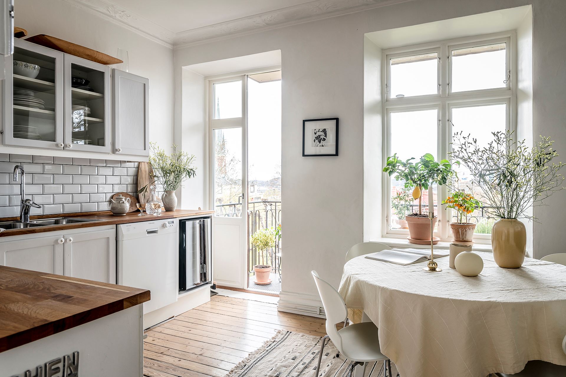 넓은 발코니와 자연스럽게 이어져 채광, 환기, 통풍이 모두 원활한 주방에는 화이트 타일로 백스플래쉬를 마감하고 원목 카운터탑이 놓인 그레이 싱크대와 주방 가전들을 깔끔하게 설치해 쾌적하고 실용적인 모던 키친을 연출하고 있다.
