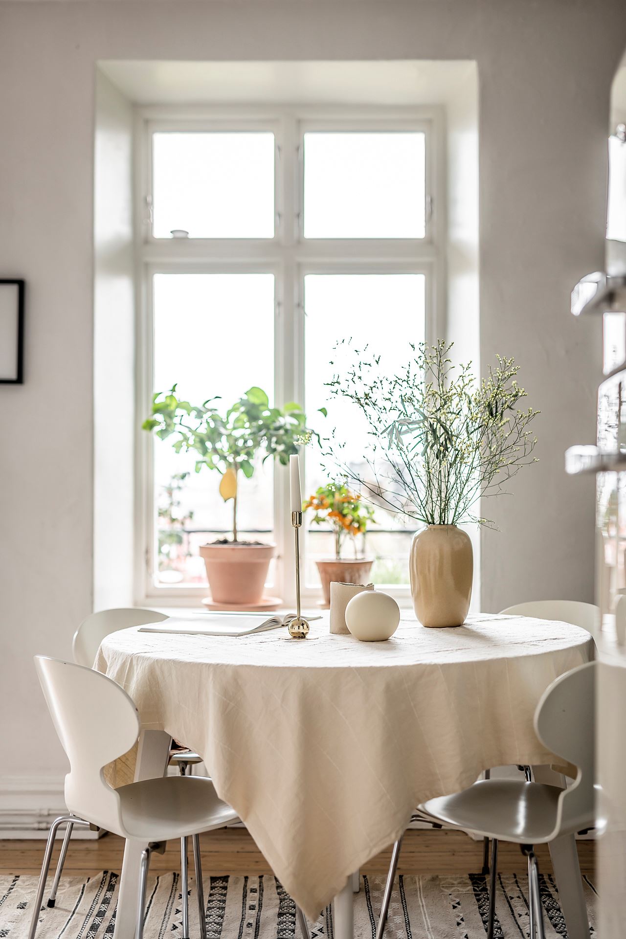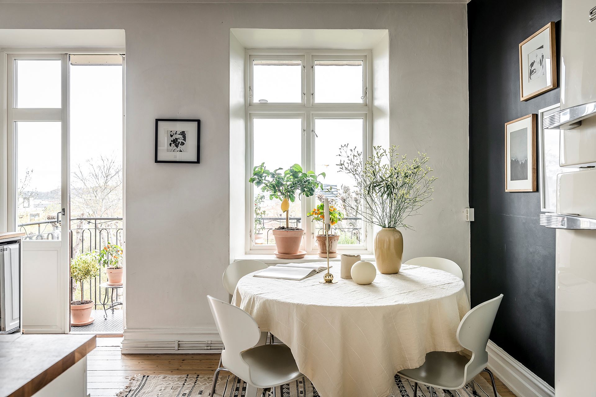 라운드 다이닝 테이블 세트가 놓인 식당은 따뜻한 햇살이 내리쬐는 창가에 자리하고 있는 주방 속 미니 다이닝 공간으로 식사와 티타임을 즐길 수 있는 예쁜 홈 카페로 스타일링되어 행복한 일상을 전하고 있다.