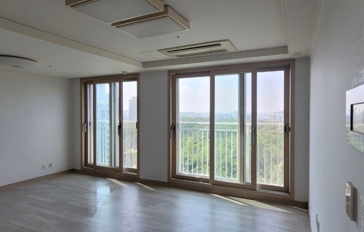 그럼 거실부터 소개해 드릴게요. 먼저 보여드린 사진은 도배를 마치고 입주 청소를 끝낸 사진이에요. 기존 파란색 벽지에서 창밖의 계절감을 더 잘 담을 수 있는 흰 벽지로 바꿨습니다. 새시도 화이트로 바꾸고 싶어서 필름 시공을 알아봤는데, 지내다 보니 나쁘지 않은 것 같아 본래 모습을 그대로 유지하기로 했어요.