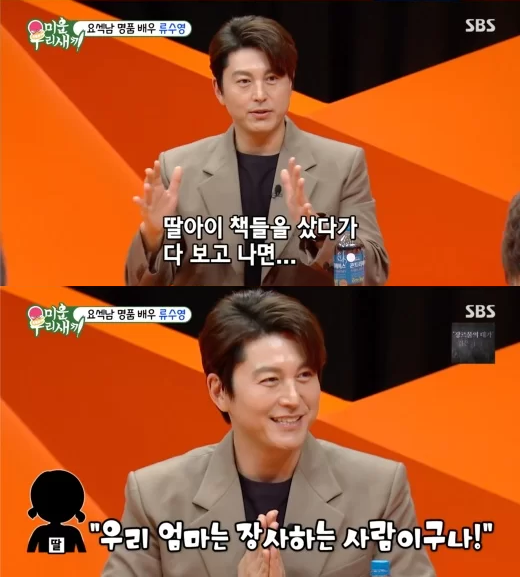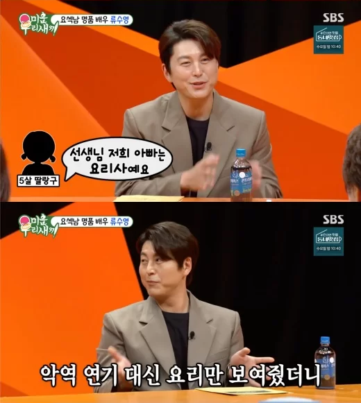 다름 아니라 마침 그때 작품 속에서 악역을 맡았던지라 딸에게 자신의 연기를 보여주지 못했던 류수영. 대신 ‘편스토랑’ 등의 프로그램을 보여줬더니 ‘TV에 나와서 요리하는 사람’이라고 이해했다고 합니다.