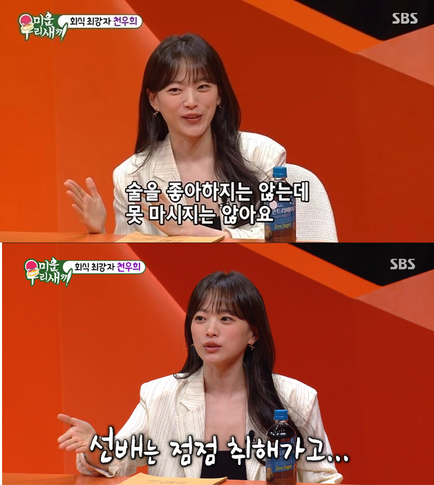 대학교 때 짝사랑하던 남자 선배와 둘이 술을 마셨는데, 아무리 마셔도 취하지 않아 결국 먼저 취해서 귀가하는 선배에게 해맑게 웃으며 “들어가세요!”라고 인사했다고 합니다.