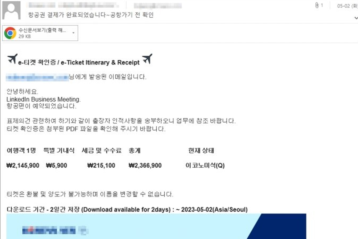 당시 이들은 ‘**항공 e-티켓 확인증입니다’라는 제목의 이메일에 악성 파일을 첨부하고 있습니다.