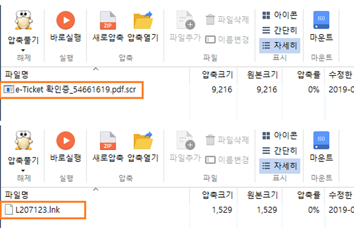 마치 특정 항공사에서 보낸 것처럼 정교하게 이메일을 보내는데요. 해당 메일에는 ‘e-Ticket 확인증_95291015.iso’이라는 그럴듯한 파일명의 압축 파일이 첨부되어 있죠.