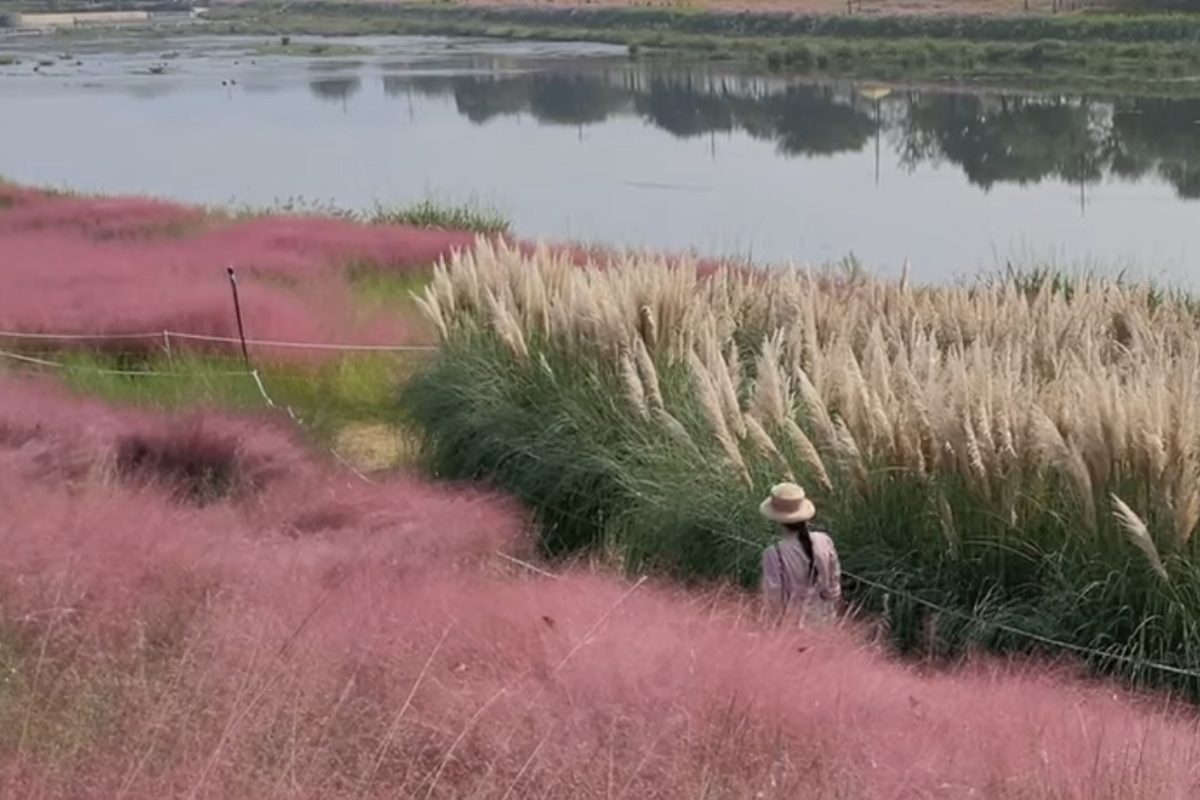 가을바람에 흔들리는 핑크뮬리는 마치 물결이 이는 듯한 풍경을 연출해 사람들의 눈을 즐겁게 합니다.