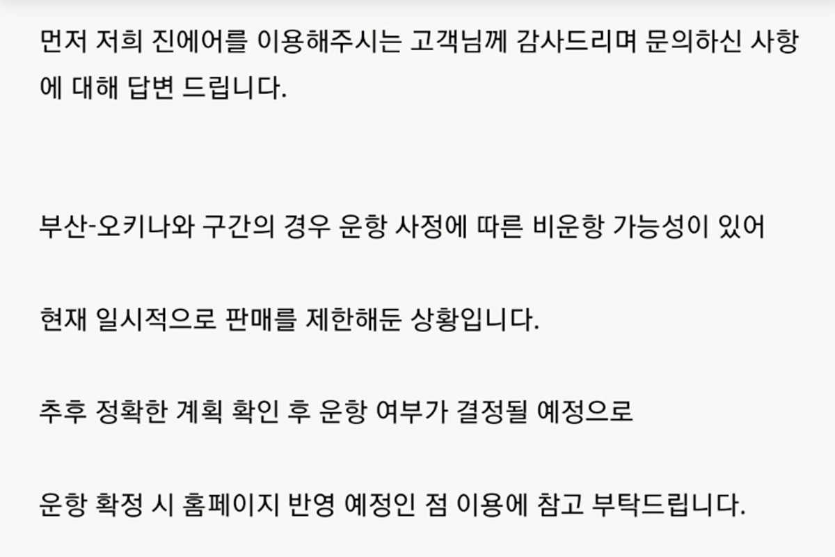 당시 진에어는 “현재 다른 운항 항공사가 없는 이 노선을 진에어가 단독 취항하며 김해공항을 이용하는 지역 주민들의 여행 편의가 확대될 것으로 기대된다“라고 말했는데요.