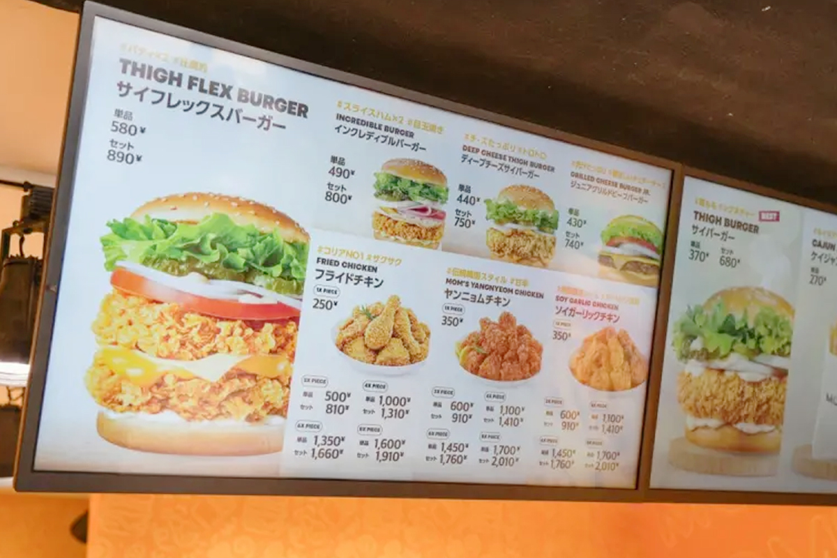 ‘맘스터치 도쿄’ 팝업스토어에서는 싸이버거와 그릴 비프 버거, 케이준양념감자, 프라이드 치킨 등 다양한 메뉴를 제공하고 있습니다.