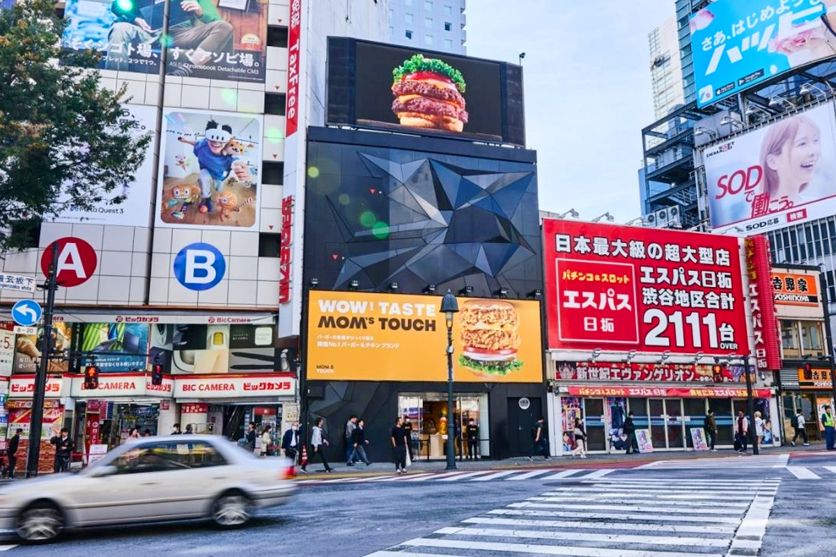 맘스터치는 시부야의 중심지에서 팝업스토어를 운영합니다.