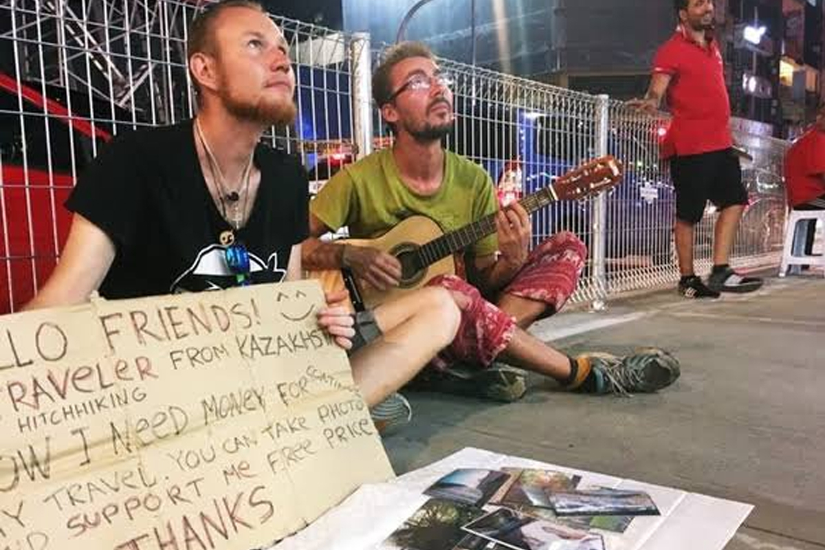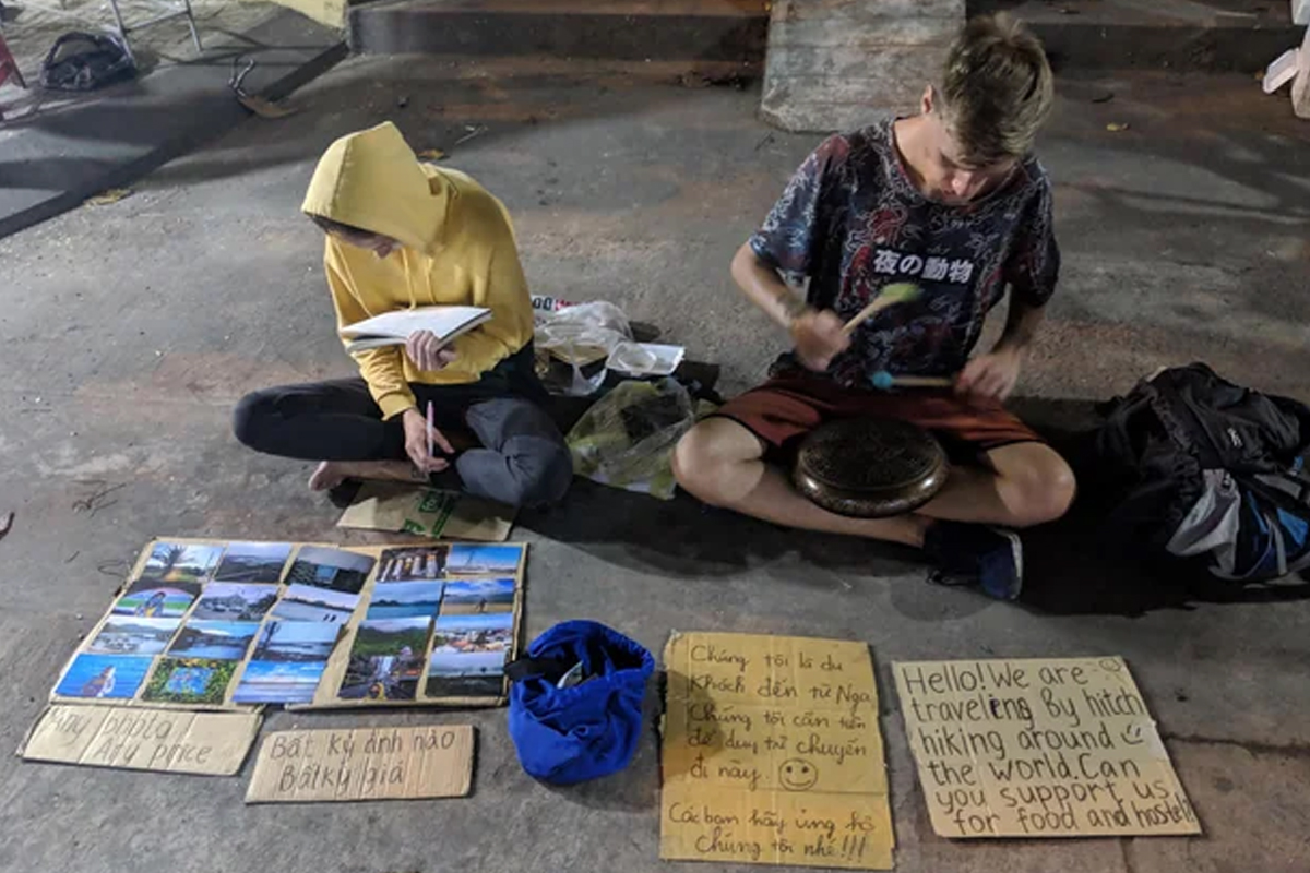 팻말에는 “안녕하세요. 우리는 러시아에서 왔습니다. 5년 동안 돈 없이 여행하고 있습니다. 우리의 여행을 도와주시면 감사하겠습니다”라는 내용이 담겨 있었죠.