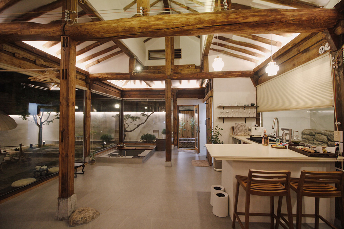 객실은 침실, 부엌, 정원으로 이루어졌는데요. 객실은 통유리창으로 이루어져 있어 마당의 풍경이 한눈에 들어옵니다.
