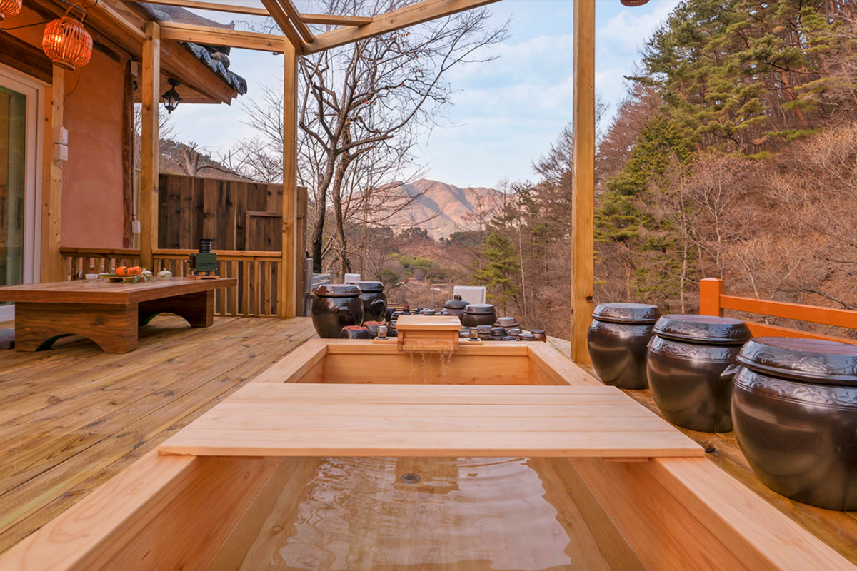 특히 감성 넘치는 노천탕의 매력 덕분에 많은 사랑을 받는 곳입니다. 산청의 경치를 즐길 수 있는 편백나무 스파와 테라스가 준비되어 있습니다.