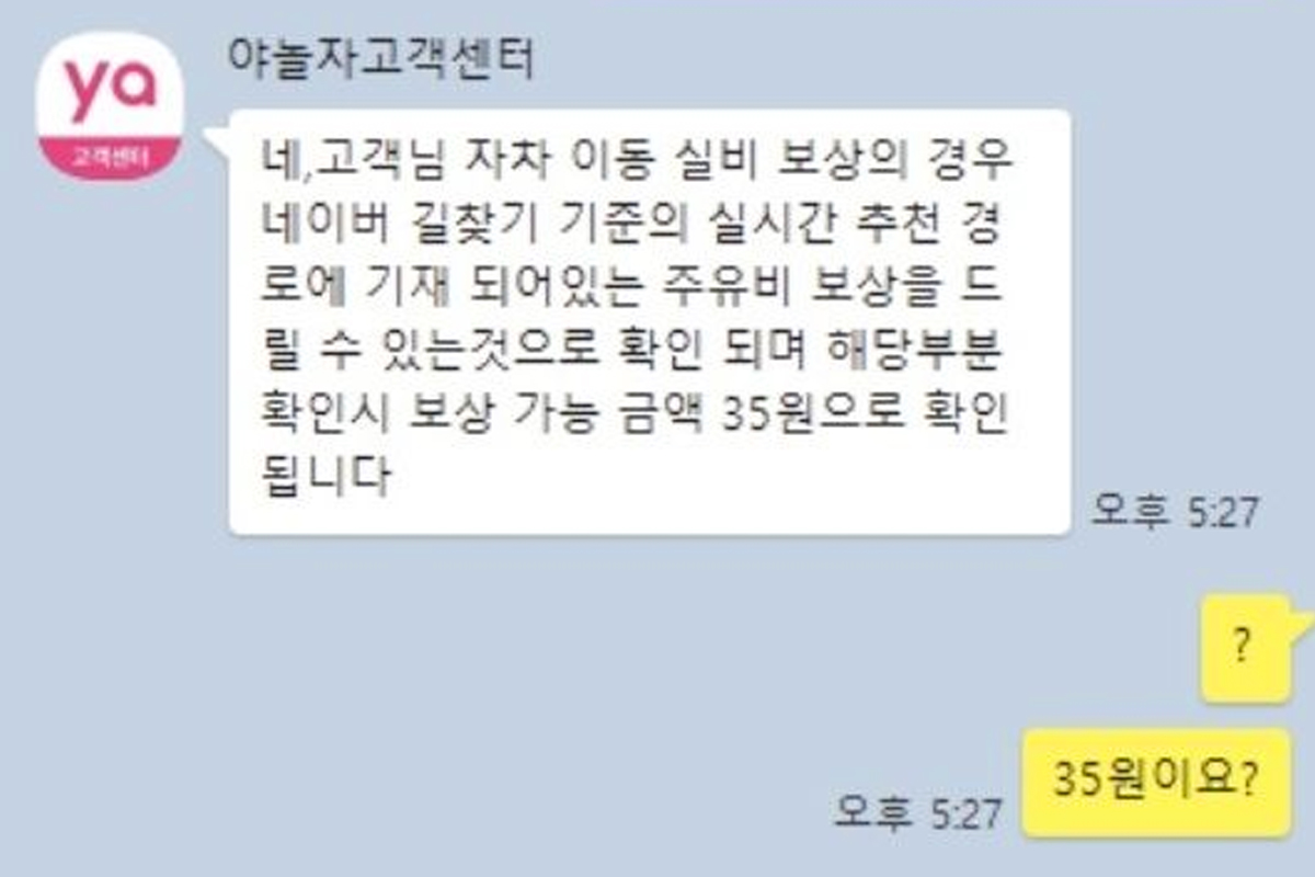 야놀자 측은 “네, 고객님 죄송하게도 네이버 길 찾기 조회 시 기존 업체에서 대체 숙소까지 이동 시의 연료비는 35원으로 확인됩니다”라고 답했죠.
