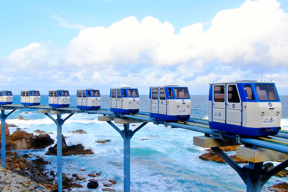 울진의 ‘죽변 해안 스카이레일’은 죽변면 죽변항에서 후정해수욕장까지 2.4km 구간을 달리는 모노레일입니다.