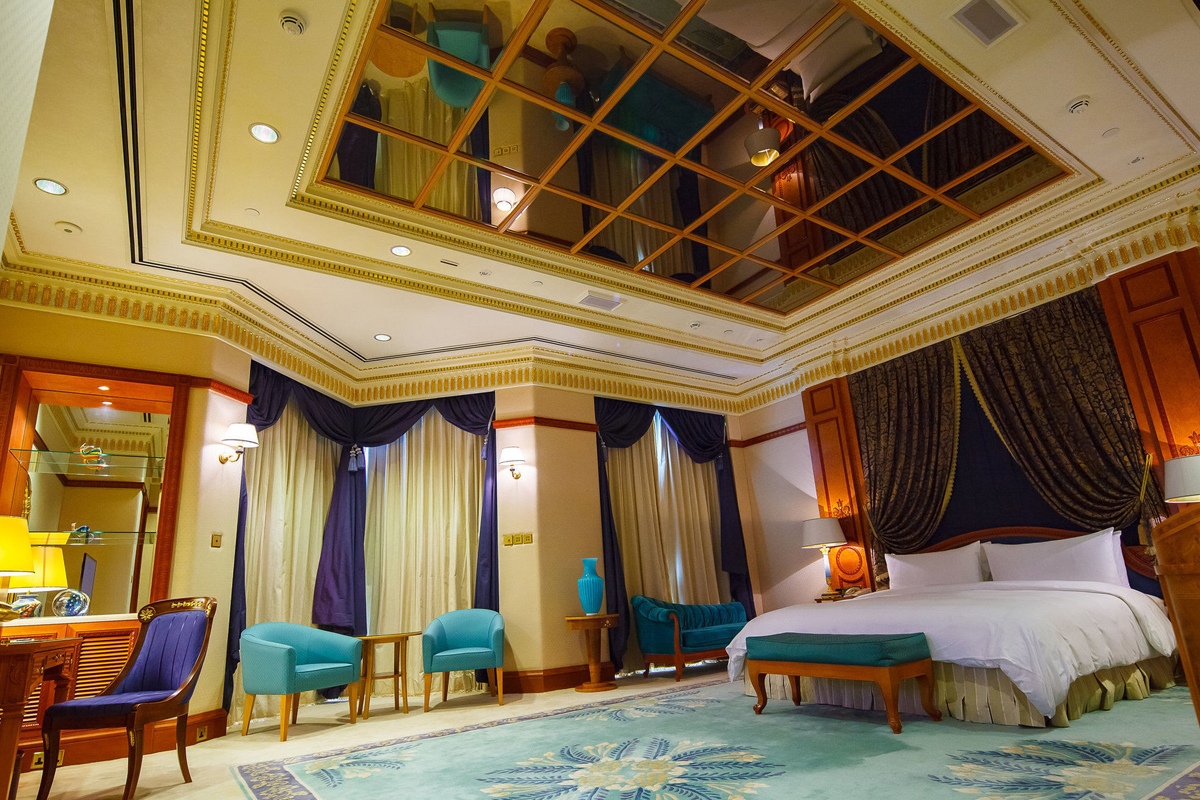 호텔 로비에는 무려 높이 30m의 황금 기둥 발코니가 있고, 기둥은 전부 24K 금으로 장식돼 있습니다. 실크 카펫에는 금가루가 잔뜩 뿌려져 있죠.