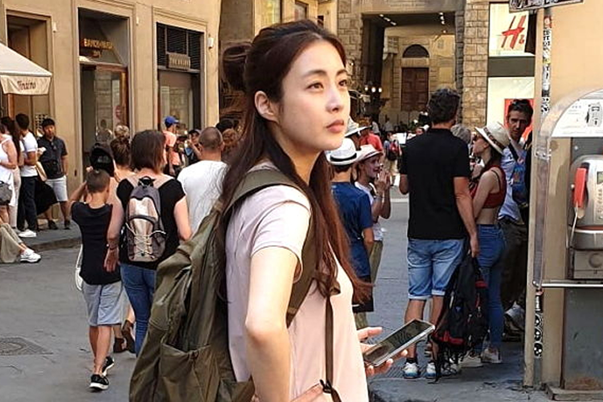 강소라는 스위스에 이어 이탈리아에서도 여행을 즐겼습니다. 그녀의 사진 속 배경이 된 장소는 피렌체의 대표 상품인 가죽제품을 파는 누오보 시장입니다.