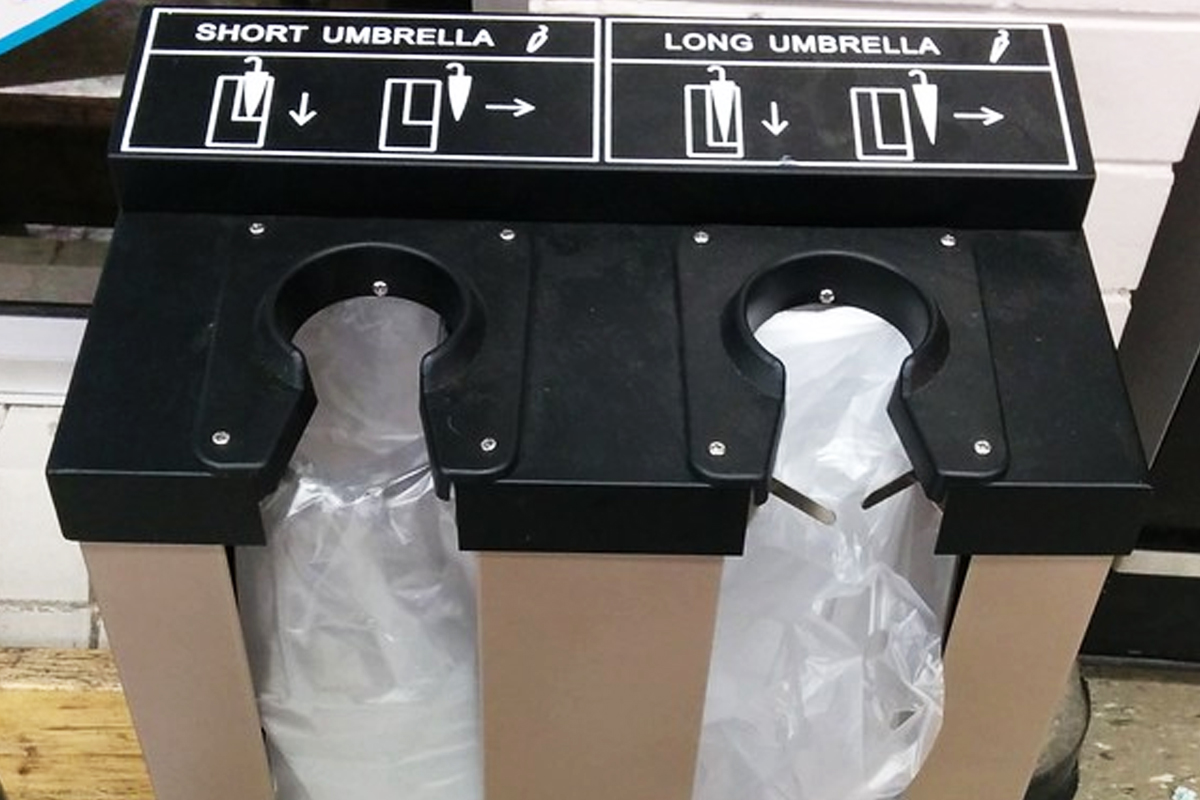 우리나라에서는 젖은 우산을 편리하게 처리할 수 있는 우산 포장기를 마련하고 있는 곳이 많습니다.