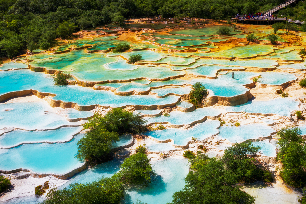 크고 작은 연못 3,400여 개가 계단을 이루고 있는 황룡은 카르스트 지형의 뽀얀 석회암을 따라 굽이치는 폭포수가 특징인데요.
