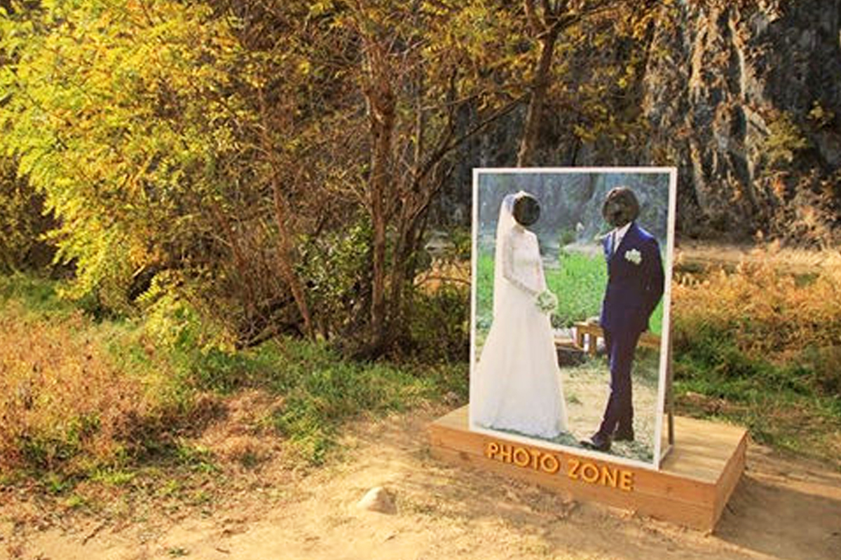 몇 년 전보다 그 인기는 사그라들었을지 몰라도 대촌마을의 뛰어난 자연 풍경만큼은 여전한데요. 원빈 이나영의 포토월은 사라졌지만, 결혼식 장소를 알리는 표지판은 자리하고 있습니다.