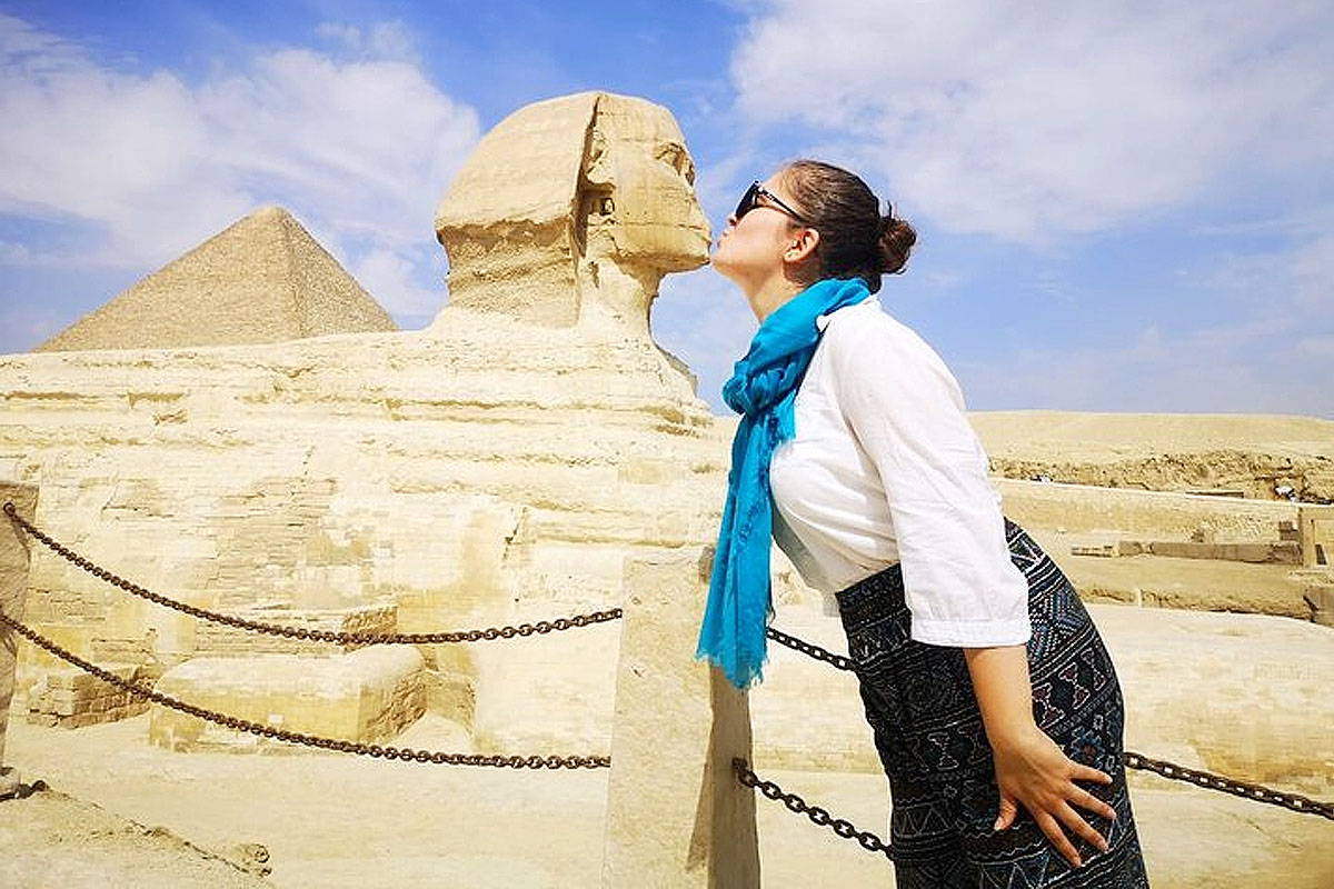 스핑크스와 뽀뽀를 하거나 손 키스를 받는 포즈가 가장 유명하다.