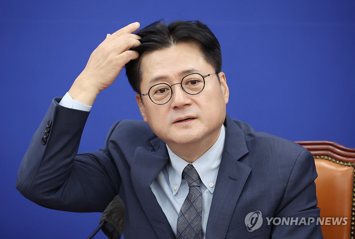 (서울=연합뉴스) 신준희 기자 = 더불어민주당 홍익표 원내대표가 2일 국회에서 열린 더불어민주당 정책조정회의에서 머리를 만지고 있다. 2023.11.2 hama@yna.co.kr